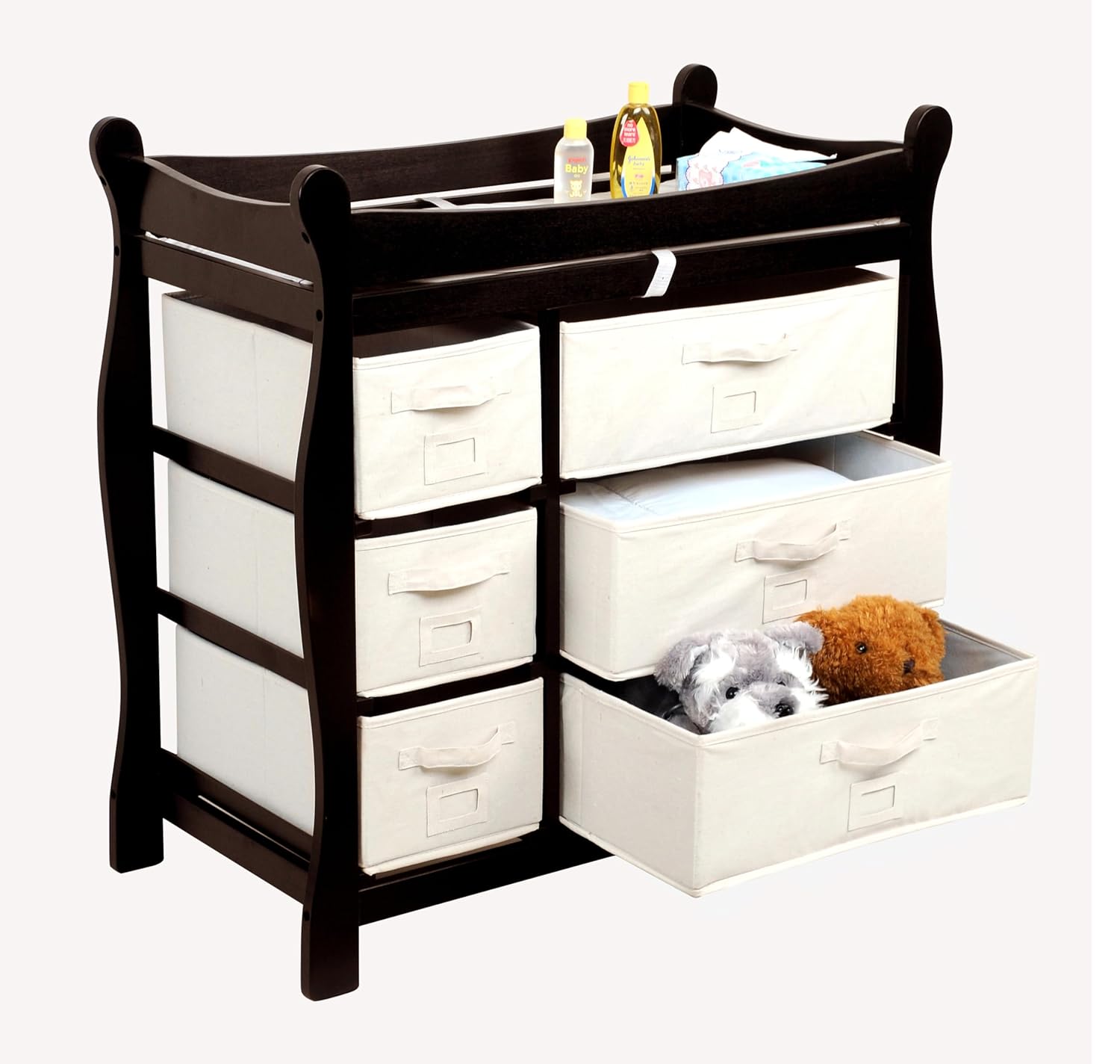 Badger Basket Sleigh Style Baby Changing Table - Diaper Station with 6 Removable Storage Baskets, Safety Rails, Pad, and Belt - Nursery Organizer - Espresso