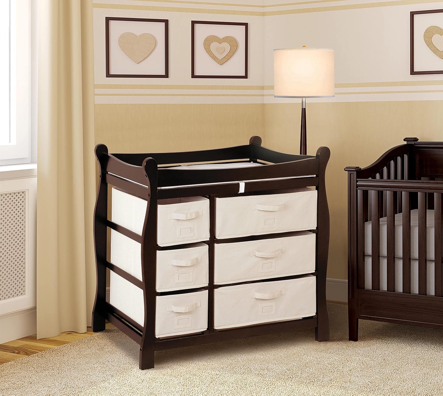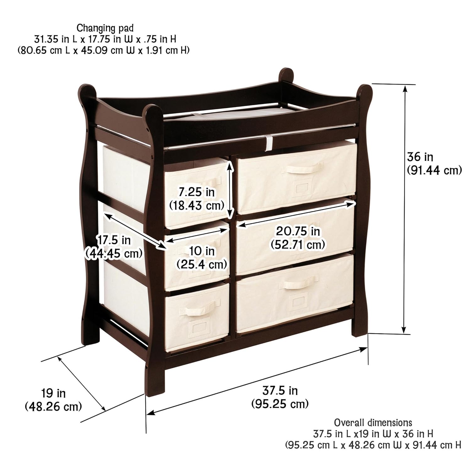 - Ample room for diaper changing on top with six storage baskets in two sizes included below