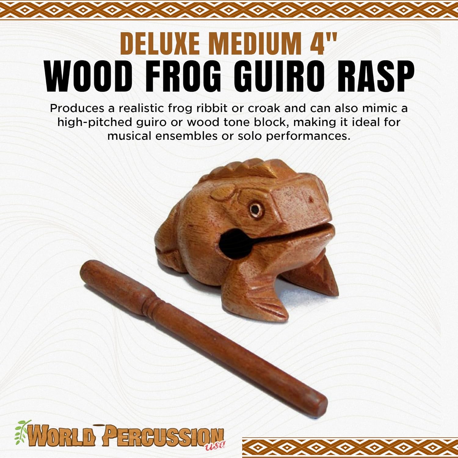 - REALISTIC FROG SOUNDS: This Deluxe Medium 4" frog sound maker produces a realistic frog ribbit or croaking sound. When used correctly, it can function as a medium-high pitch guiro or as an alto wood tone block, making it an excellent addition to any musical ensemble or solo performance.