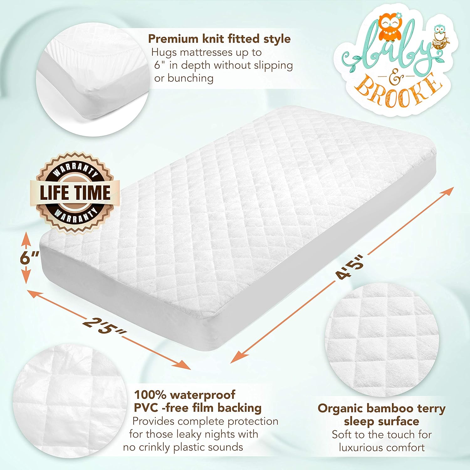 Organic Bamboo from Viscose Fitted Crib Mattress Protector Pad by Baby&Brooke – 100% Waterproof, Absorbent, Non-Toxic, Breathable Mattress Cover - (52"x 28"x 8")