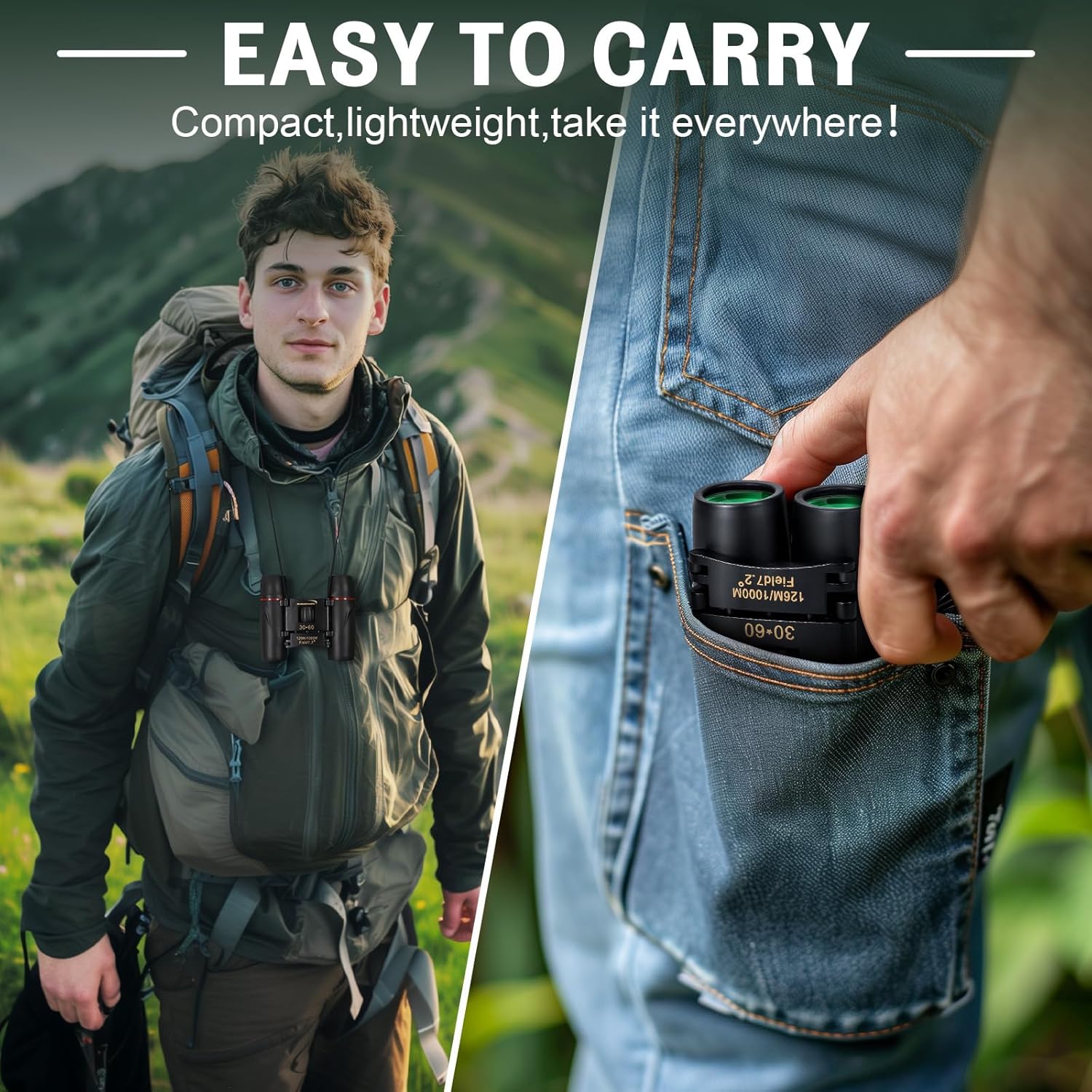 - LIGHTWEIGHT AND COMPACT BINOCULARS: You can throw them into your backpack every day without hesitation, mini pocket binoculars add very little weight to your backpack, less than 0.5 pounds, very convenient and value for money.