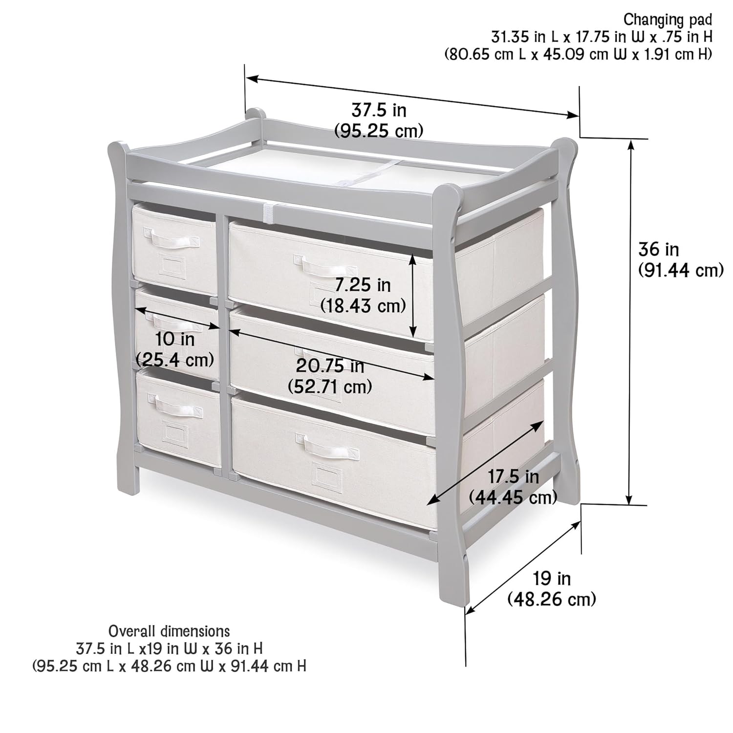 Badger Basket Sleigh Style Baby Changing Table - Diaper Station with 6 Removable Storage Baskets, Safety Rails, Pad, and Belt - Nursery Organizer - Gray/White
