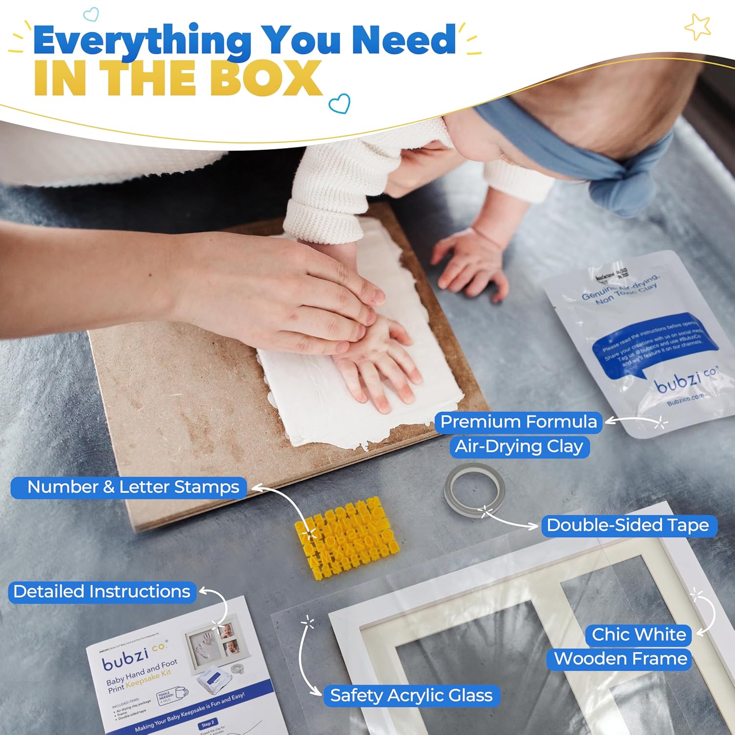 - EASY TO USE FOR BABY AND PETS The Bubzi co baby keepsake frame is designed with you in mind. Even with the tiniest, wiggliest, fingers and toes, you can flawlessly capture your newborn's handprint, footprint ( or even paw print ). Simply press their tiny hand or foot into the soft, air-drying clay to capture a precious imprint you will cherish forever!