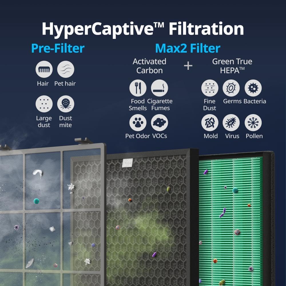 - [HyperCaptive Filtration System] Dynamic combination of a washable pre-filter, activated carbon filter, and Green True HEPA Filter effectively reduces 99.999% of 0.01-micron particles in the air, including pollen, pollutants, and other allergens; It also reduces 99% of volatile organic compounds and odor