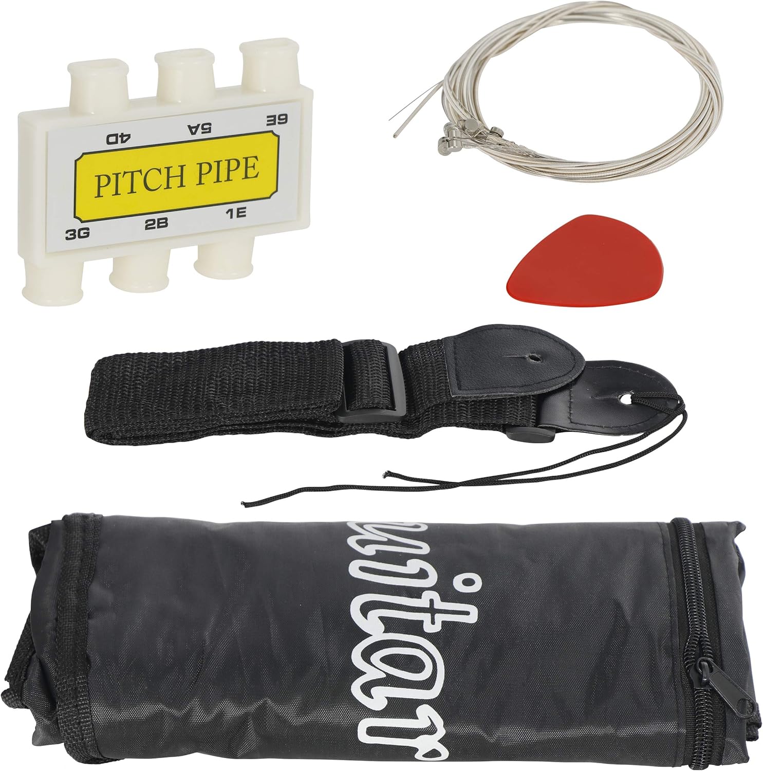 - 【Guitar Bundle - More Efficient】This guitar contains everything the beginner needs in one box, a guitar pick, pitch pipe, a shoulder strap, and an extra set of strings for replacement; And the parts accessories are in the small boxes inside of the guitar box, please check them when you received.