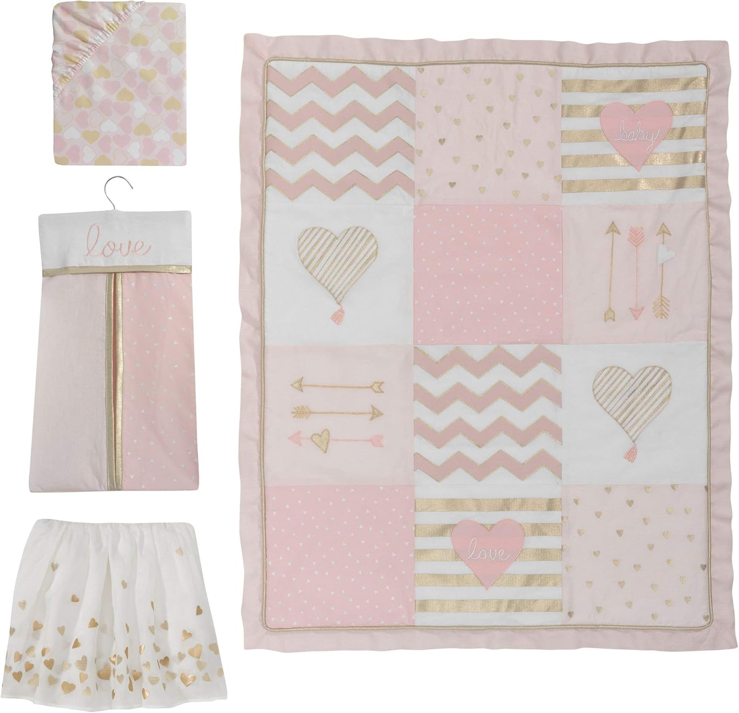 - Metallic gold hearts decorating the dust ruffle which has a 14.5” drop is perfect for any baby girl nursery.