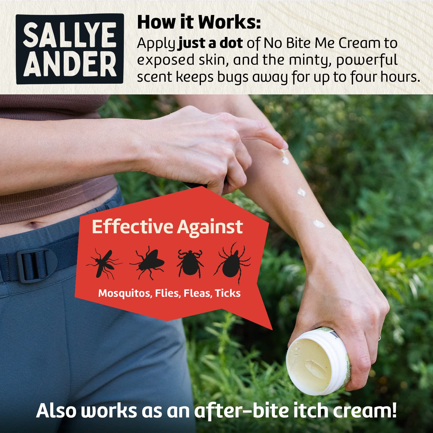 - 2-IN-1 BUG REPELLENT & AFTER-BITE CREAM: “No-Bite-Me” does it all! Our cream-based formula repels bugs AND relieves itchy, bug-bitten skin with soothing, moisturizing beeswax. Plus, it’s an all-natural bug repellent, baby safe, and beloved by moms everywhere.