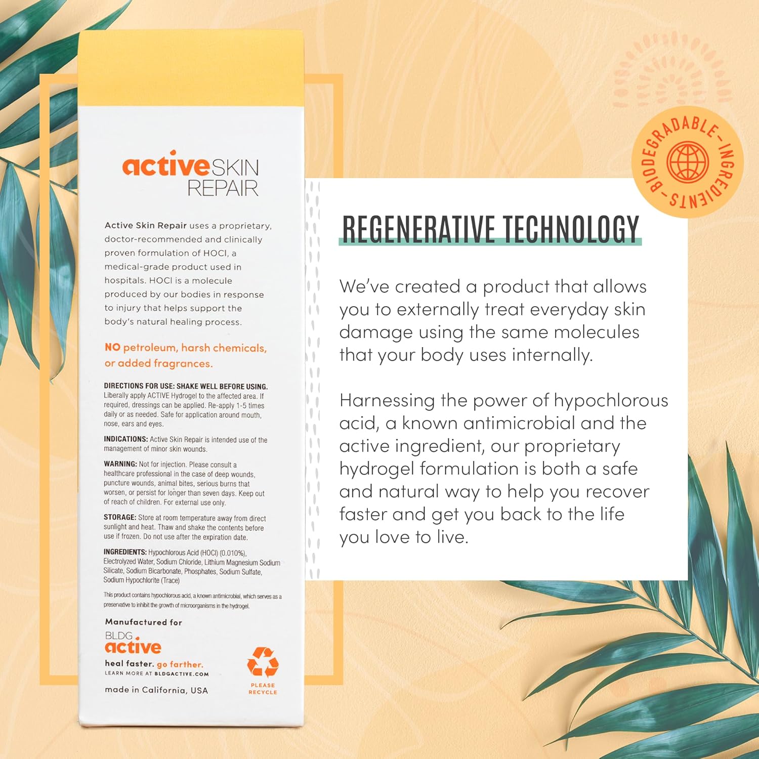- FIRST AID HYPOCHLORUS ACID HYDROGEL: The technology used in Active Skin Repair is the same safe and gentle molecule used in hospitals & households worldwide; Hypochlorus Acid cleanse wounds to help skin recover faster