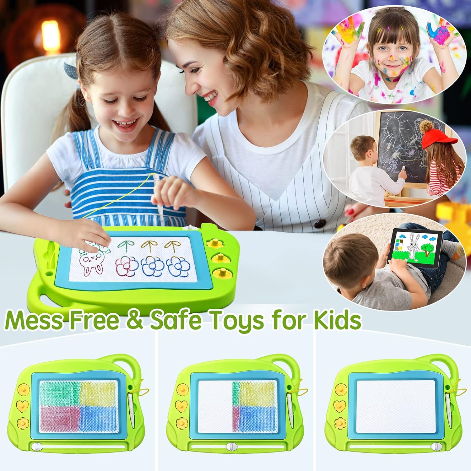 - Easy to Use: This Magnetic Board includes a Large Drawing Screen with 3 Stampers(1 circle, 1 flower and love), 1 Easy Slider Eraser and 1 Pen. Hours of No-Mess Magnetic Colorful Drawing Fun, Start Your Kids' Creativity