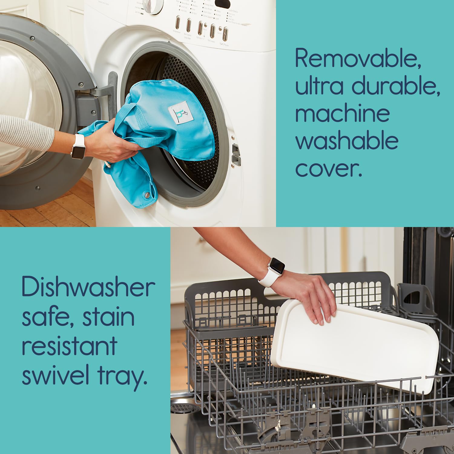 - MACHINE WASHABLE COVER | We all know that babies are messy eaters! Our portable booster seat is designed to effortlessly wipe clean, allowing more quality time with your precious tot. To assist with the inevitable mess, the fabric cover slides off the frame for machine washing - a must have for sanitizing and spaghetti stain removal.