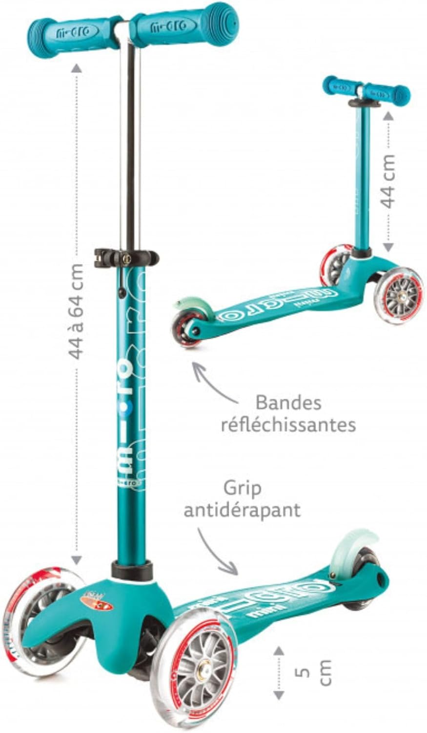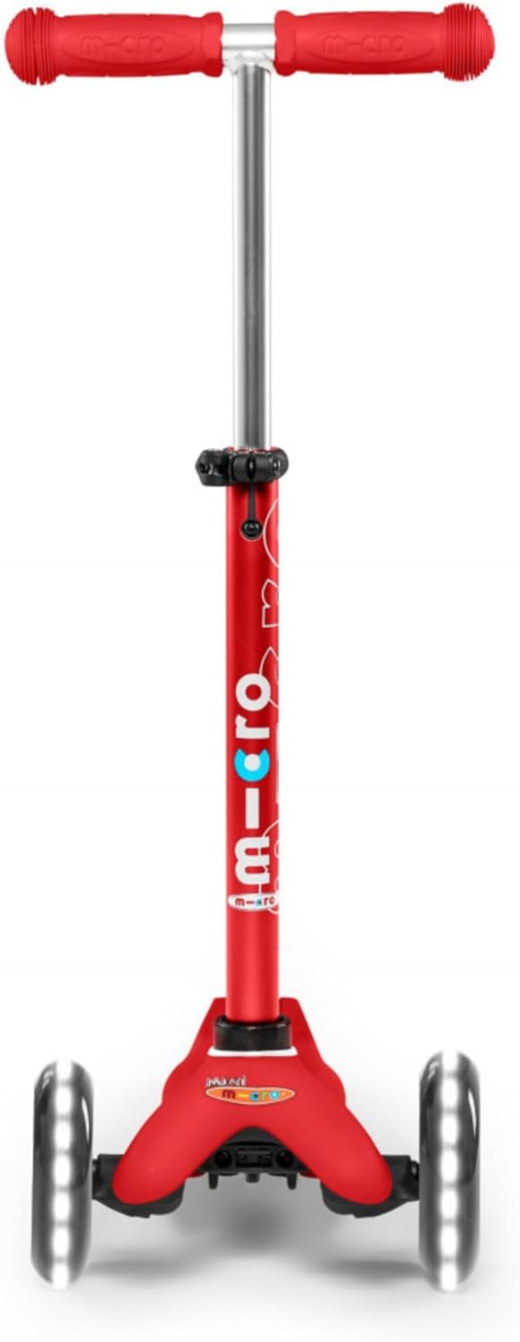 - Micro's 3-wheeled Mini Deluxe LED scooter, with a lean-to-steer design, offers a stable ride that supports toddlers and small children as they master balance and coordination. Features two front LED motion-activated light-up wheels. (No batteries required!)