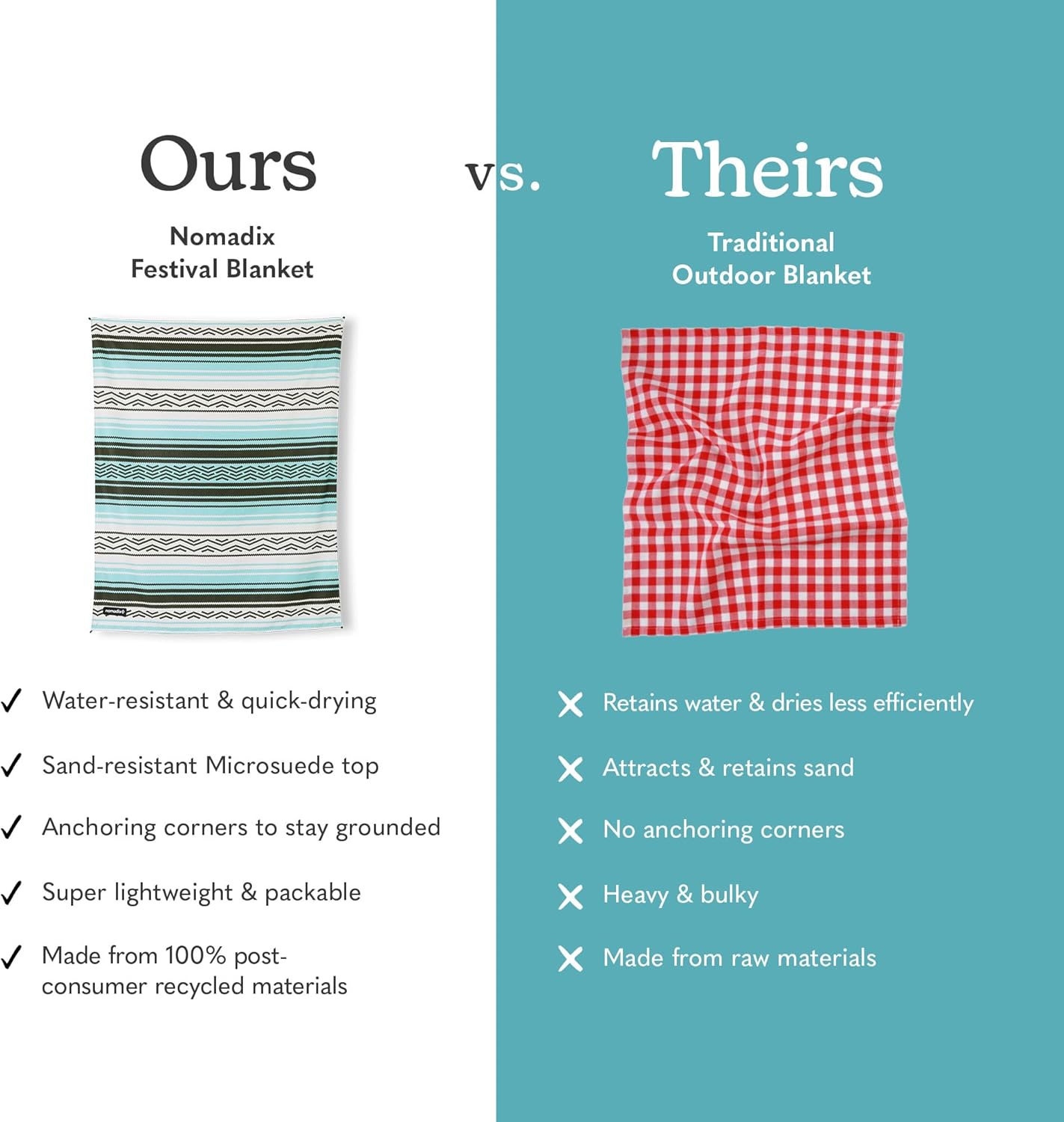 - Made With Post Consumer Recycled Materials: We aren't using virgin plastic to make our products. We source already used plastics to build our festival blankets.