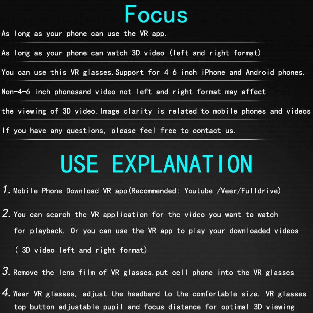 - Use explanation: 1.Mobile Phone Download VR app(Recommended: Youtube /Veer/Fulldrive).2.You can search the VR application for the video you want to watch for playback. Or you can use the VR app to play your downloaded videos ( 3D video left and right format).3.Remove the lens film of VR glasses.Put the phone in the VR glasses and place it in the center as much as possible.adjust the headband to the comfortable size. VR glasses top button adjustable pupil and focus distance for optimal 3D viewing