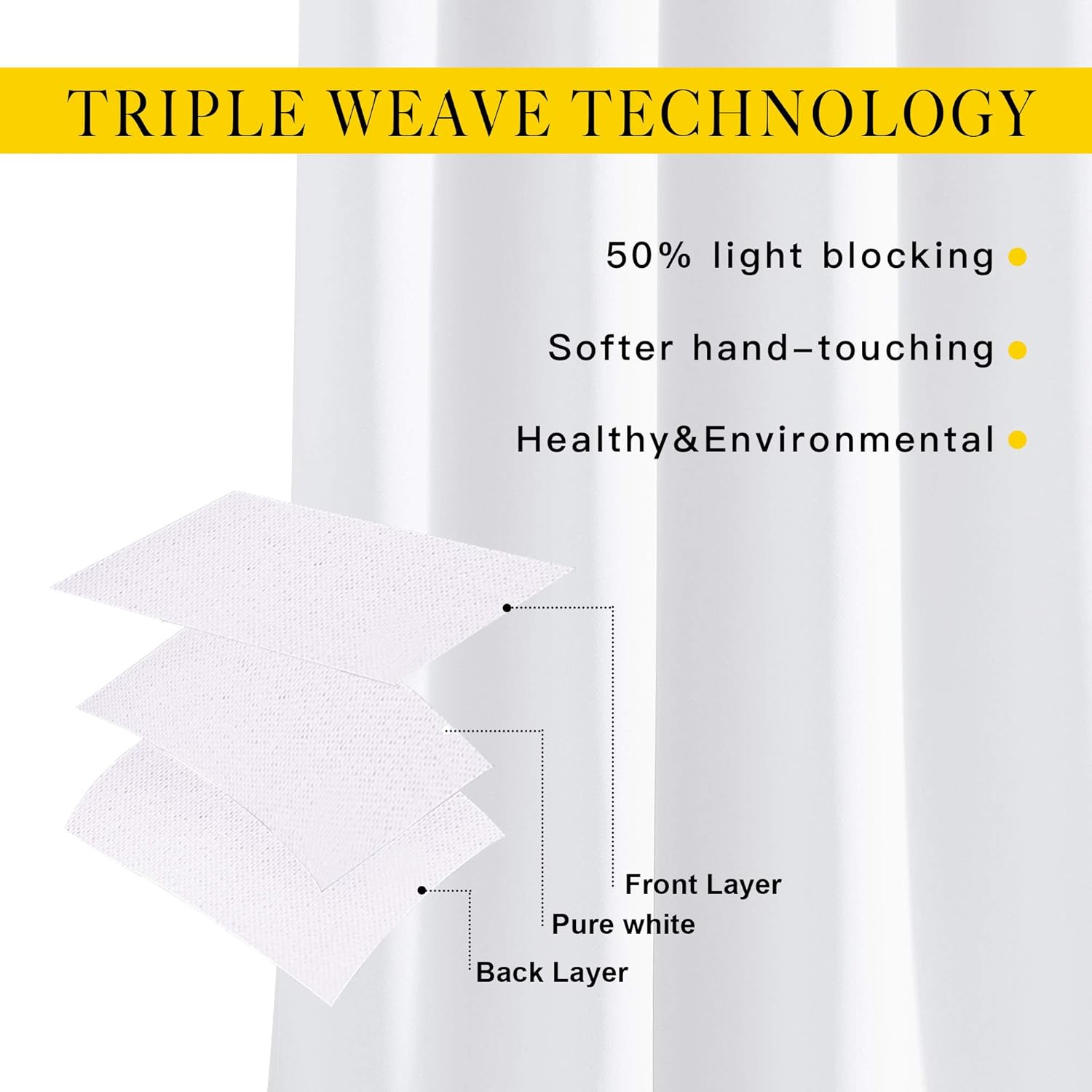 - Real White: Curtains adopt triple weave technology. Unlike other curtains where the middle layer is black, the middle layer in this curtain is white yarn. So you don't have to worry that white has impurity.