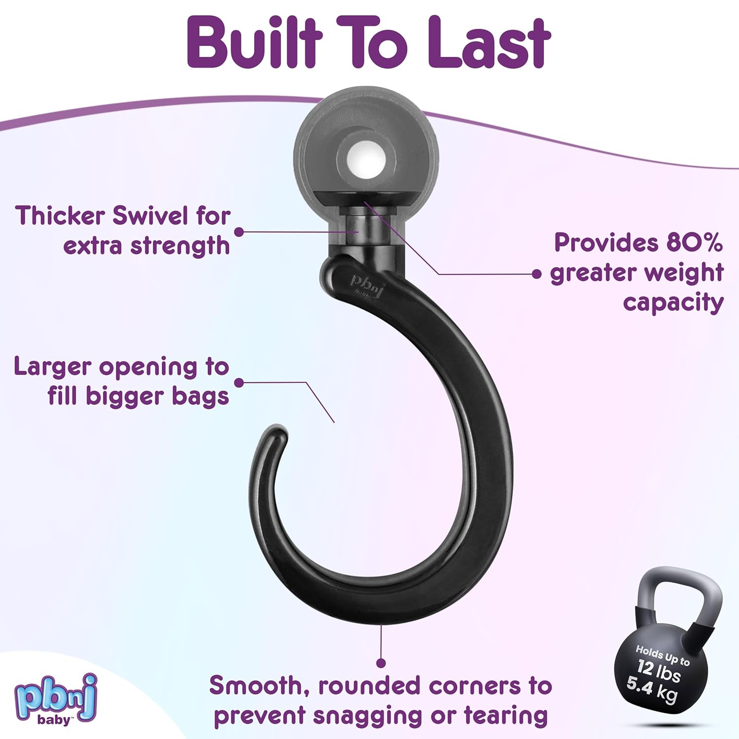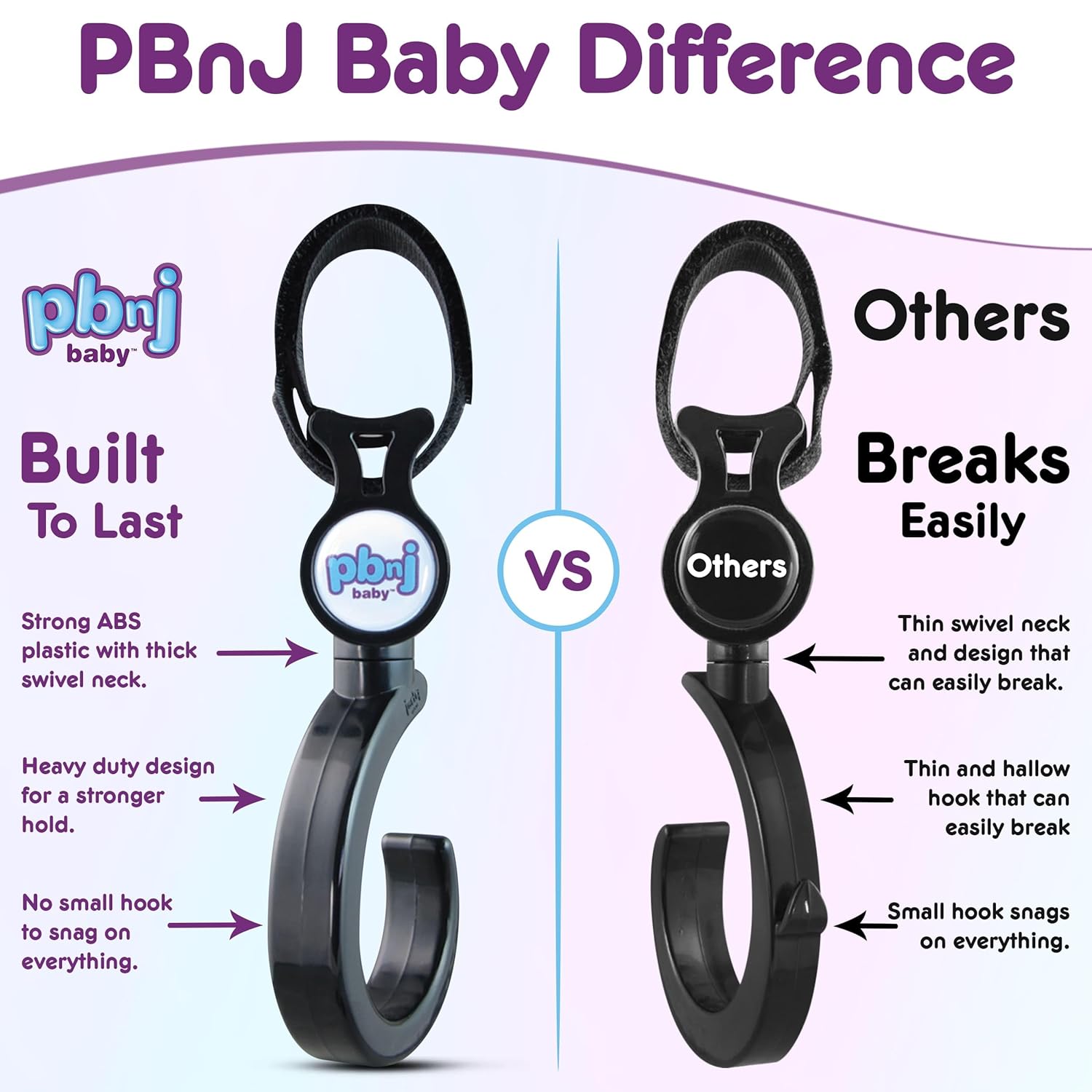 - PATENTED: This PBnJ Stroller Hook is designed to protect your expensive bags and purses when you are out shopping! The patented hook ensures each of your item’s rest on the smooth plastic surface, protecting them from direct contact with the metal like other brands.