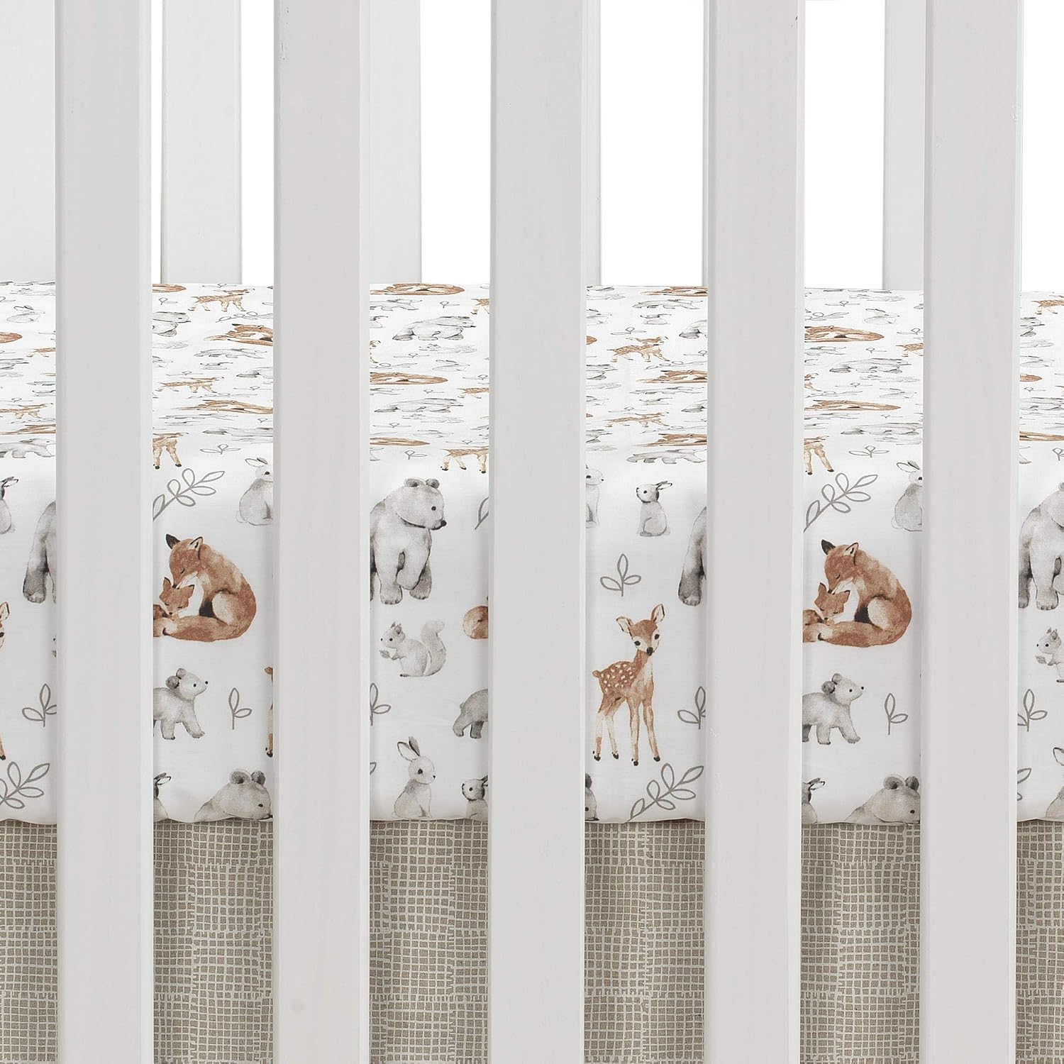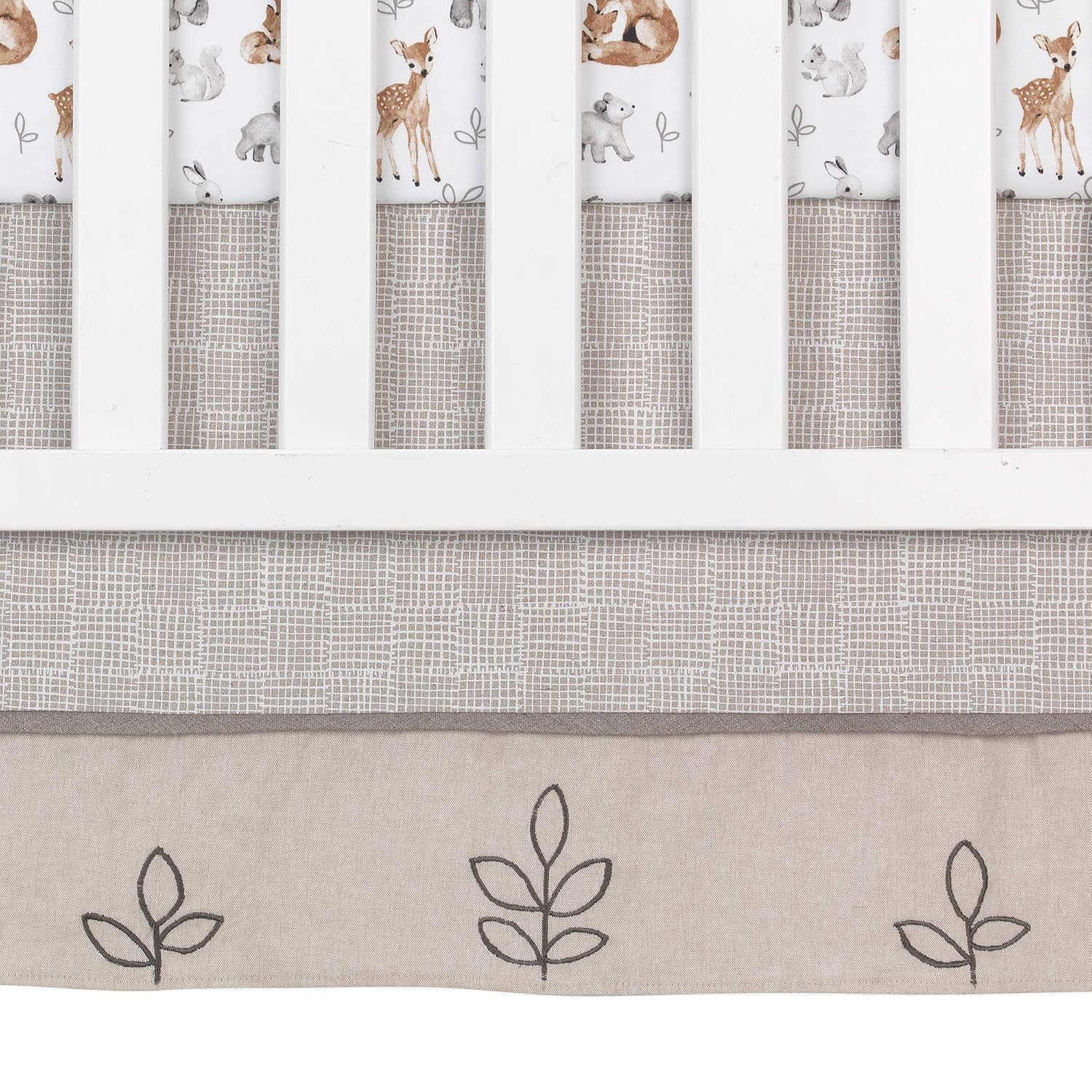 - An embroidered leaf design is featured on the front of the crib skirt and the cotton fitted crib sheet features sweet watercolor forest animals