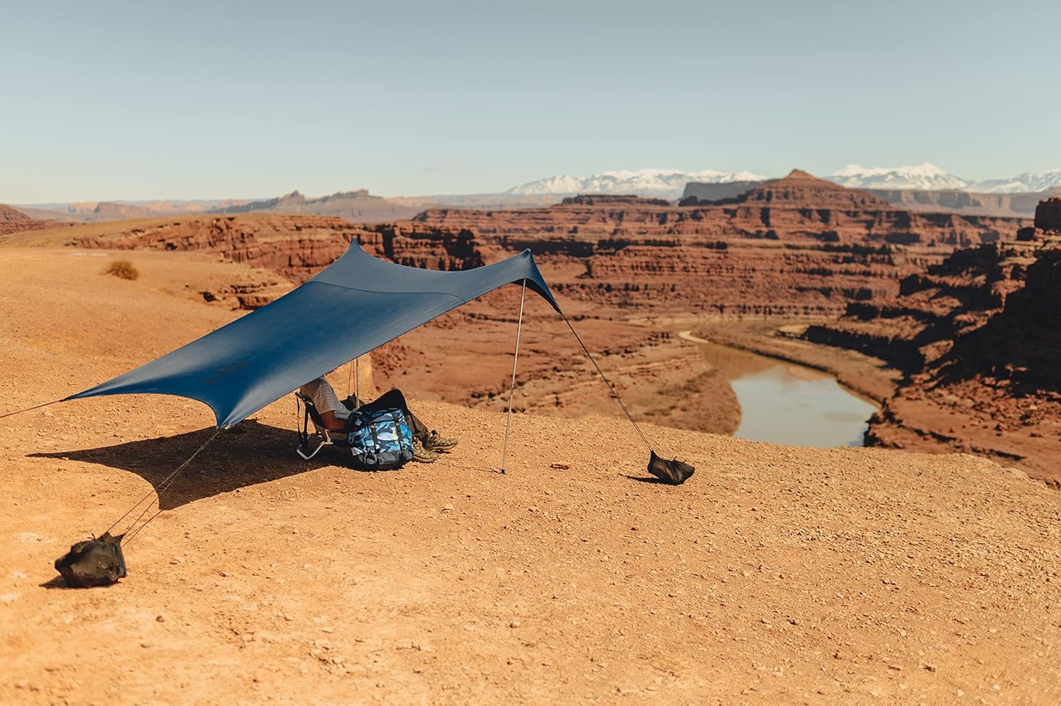 - 7 x 7 NESO TENT (Color). Made for the outdoors, your Neso Tent weighs in at 4 lbs/ 19.5 inches. It can easily fit over your shoulder or in your carry-on. Use sand or rocks to stabilize, so you’ll always have shade for your next adventure.