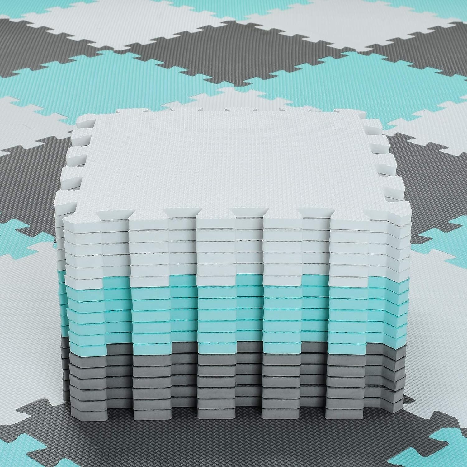 qqpp EVA Rubber 18 Tiles Interlocking Puzzle Foam Floor Mats - Baby Play Mat for Playing | Exercise Mat for Home Workout. White, Green, Gray. QC-AHLb18N