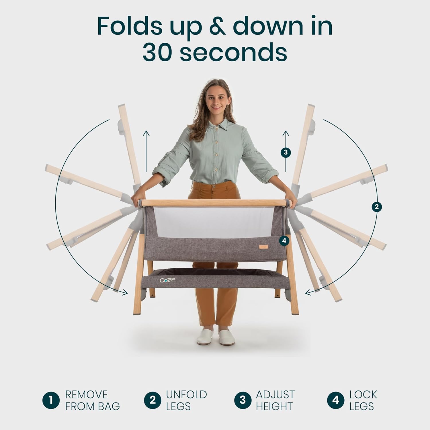 - SET UP IN 30 SECONDS - Thanks to our innovative fast-folding mechanism, the baby bedside bassinet is ultra quick to set up! The wood-effect legs lock securely into place to keep the bedside crib stable.
