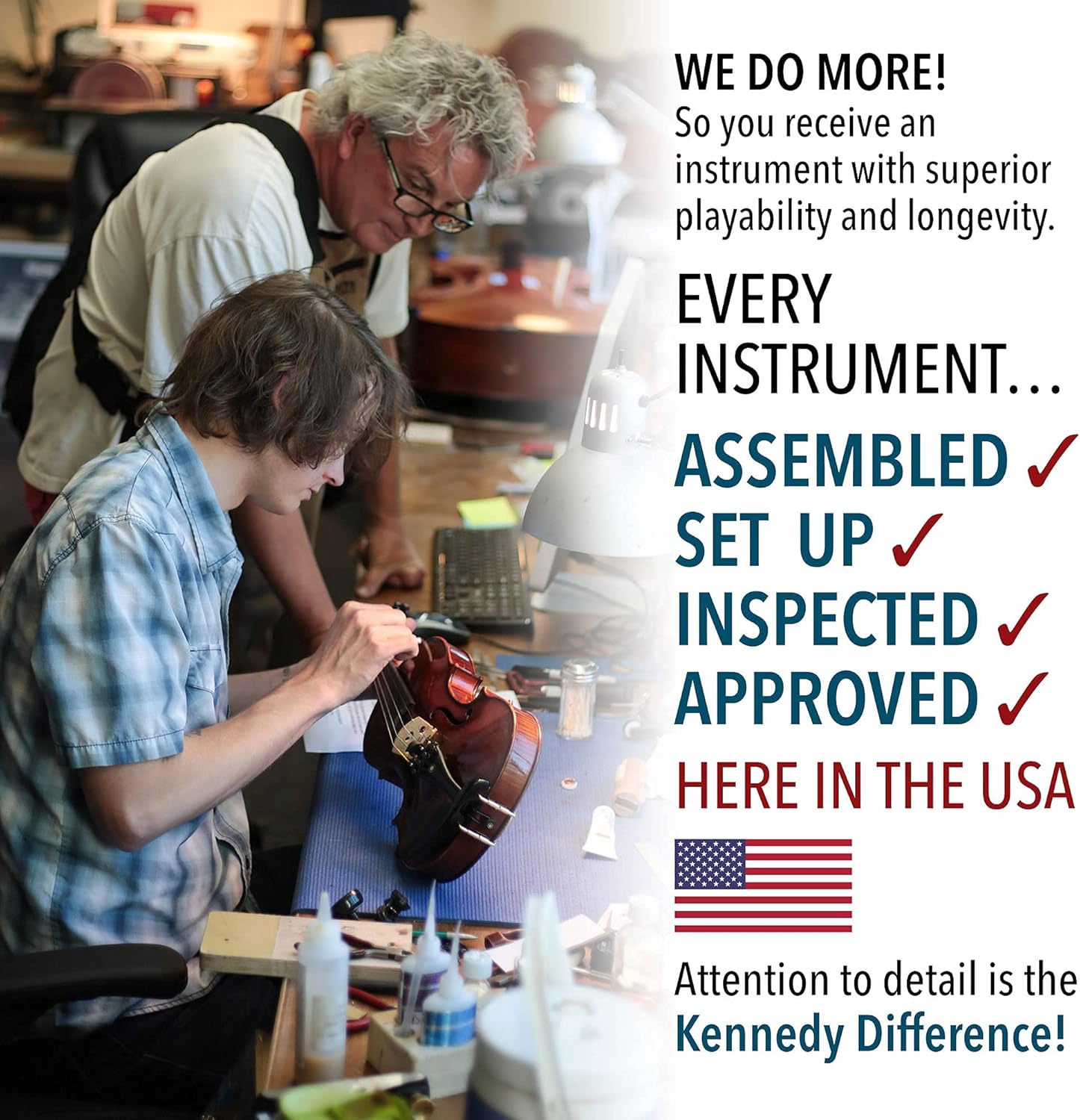 - [ASSEMBLED AND QUALITY CHECKED IN THE USA] Our final assembly and set-up are in the USA, NOT in China. Quality set-up equals LONG TERM performance. Improper set-up can lead to poor quality sound and damage to the instrument. We send you an instrument ready to tune and start playing right away.