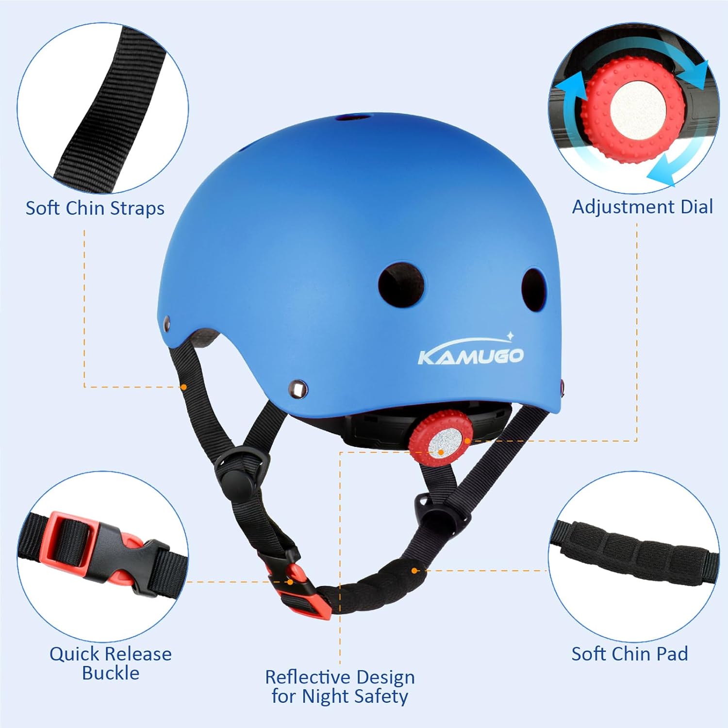 - 【Meets Safety Requirements】- KAMUGO sport toddler helmet for kids is tested and complaint with federal children's product safety requirements. Made of impact-resistant ABS shell and high density EPS foam, equipe with protective gear set. Effectively protect your kids from injuries during multi-sports