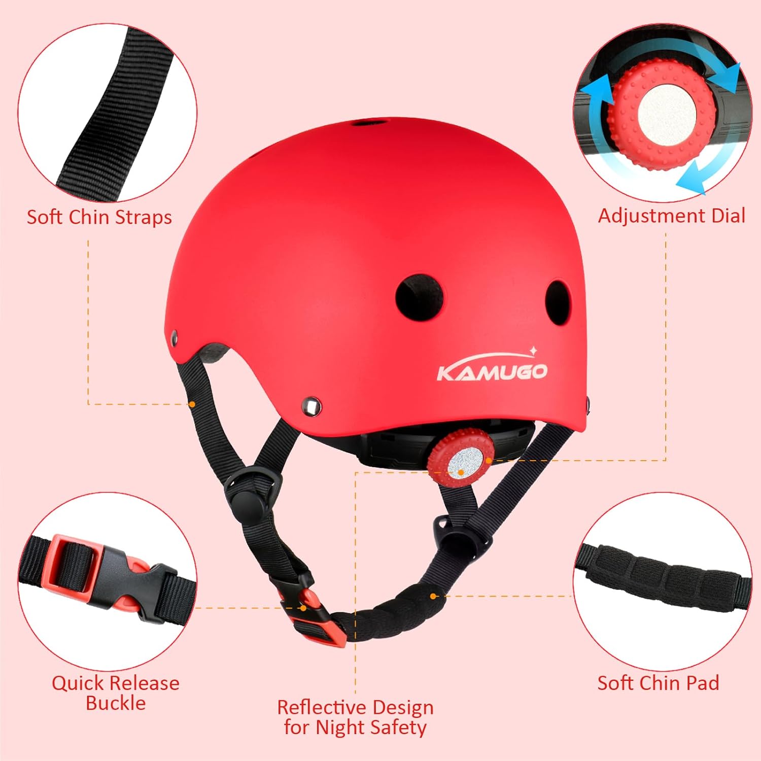 - 【Meets Safety Requirements】- KAMUGO sport toddler helmet for kids is tested and complaint with federal children's product safety requirements. Made of impact-resistant ABS shell and high density EPS foam, equipe with protective gear set. Effectively protect your kids from injuries during multi-sports