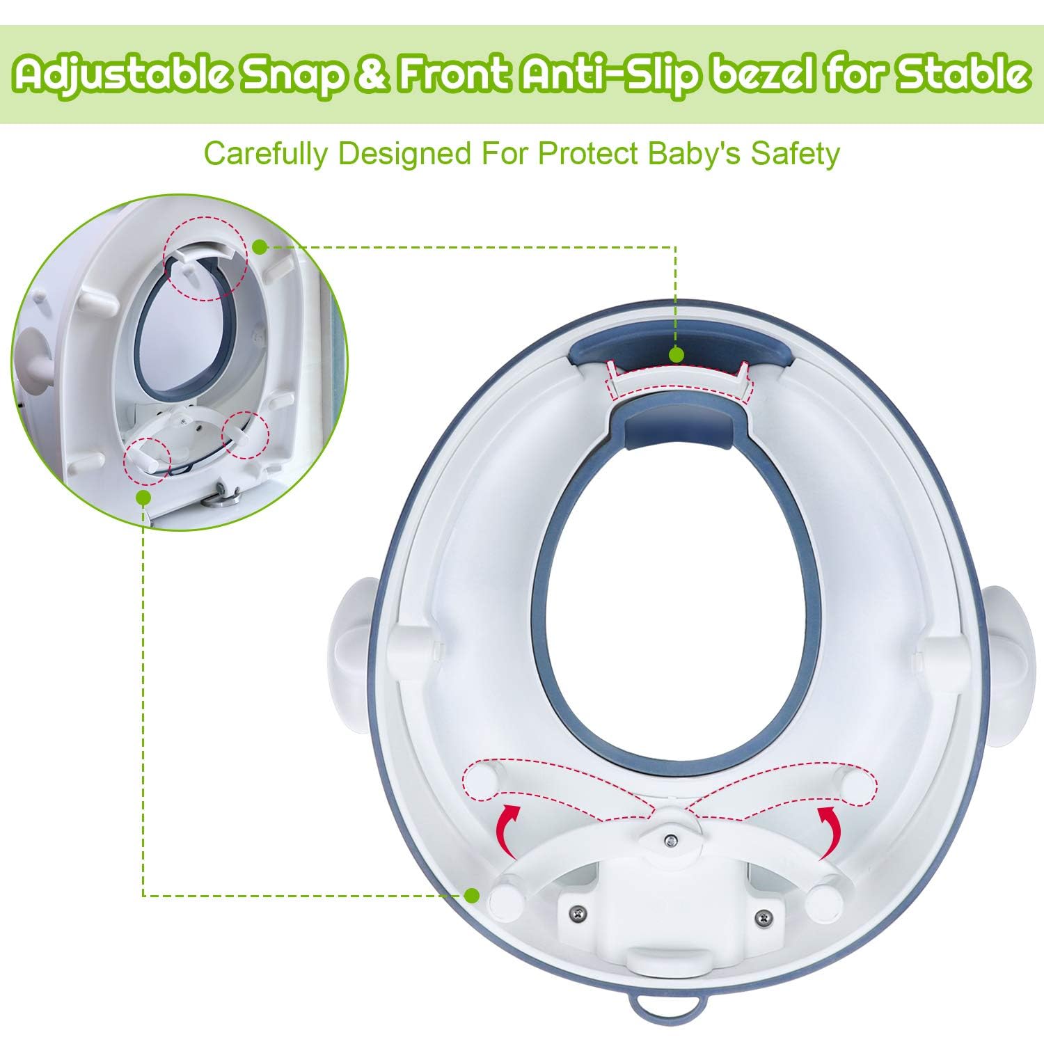 - Stable and Patent Design - Adjustable snap and front anti-slip bezel keep the toilet training seat securely in place, the grip handles offer additional security which makes your kid feel safe while sitting on it. Cultivate child's ability of independent toilet and stimulate your baby's potential for independence.