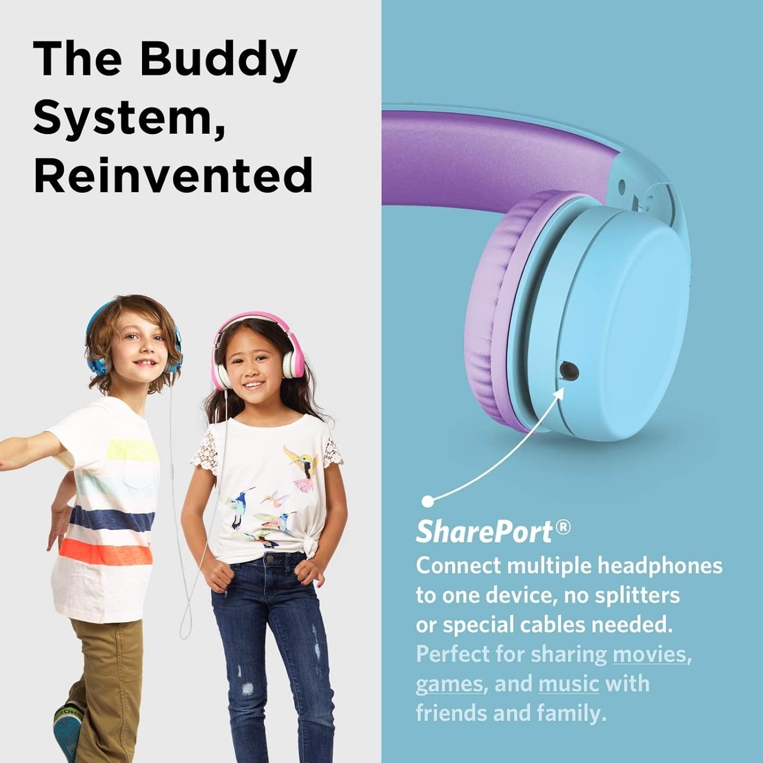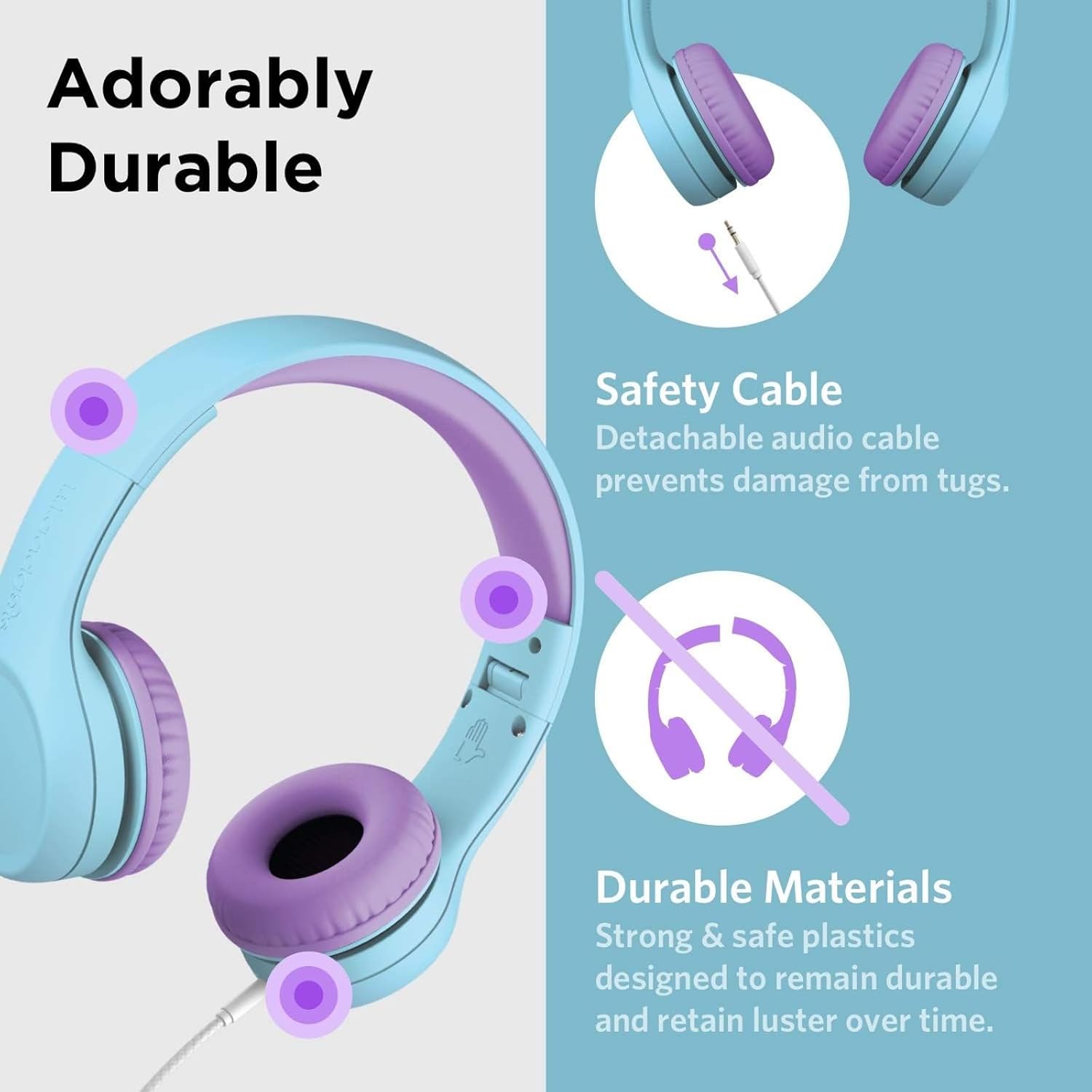 LilGadgets Connect+ Wired Kids Headphones for School with Mic, Volume Limited & Noise Reduction, On-Ear Headset with Cord, SharePort Technology for Multiple Kids & SoftTouch Padding, Blue/Purple