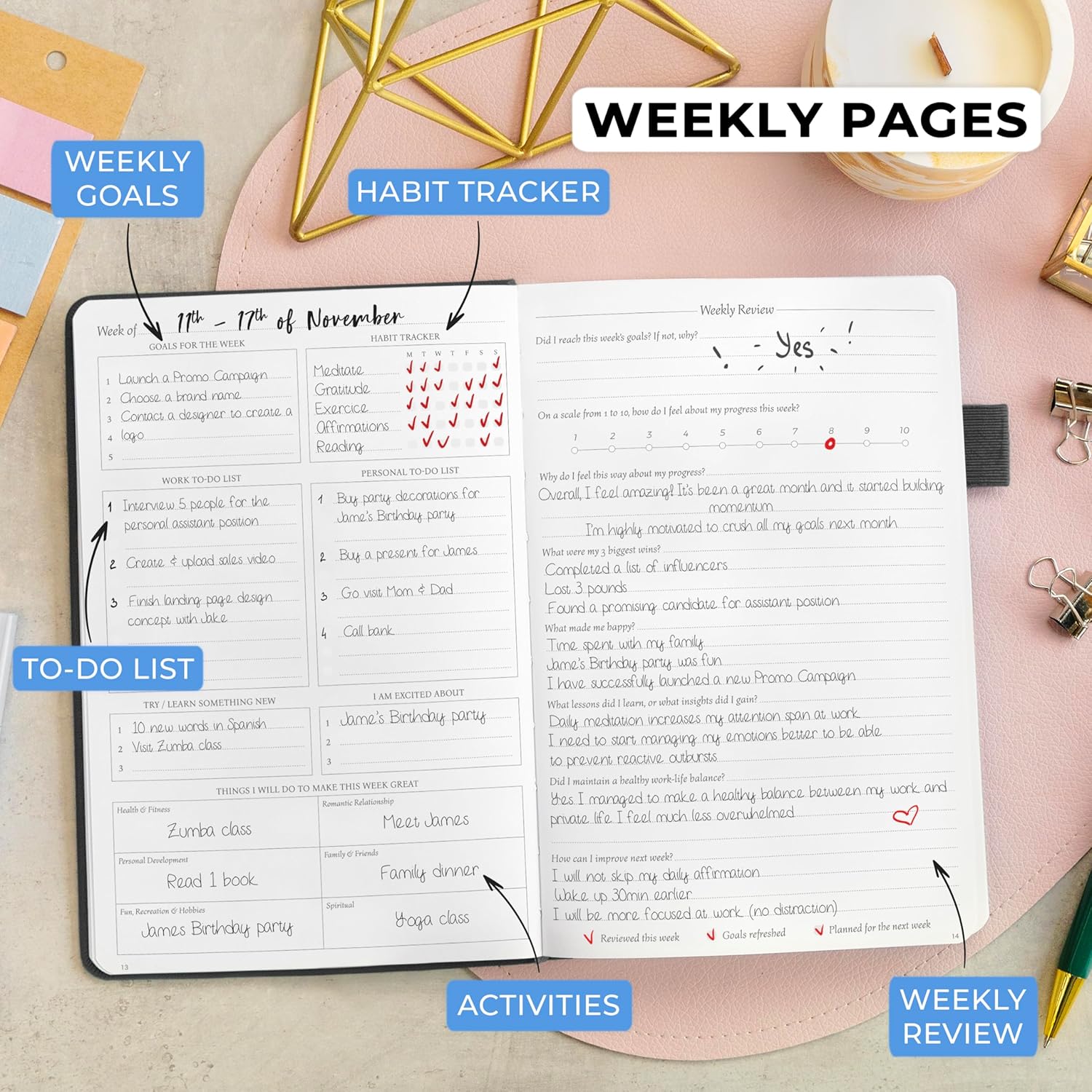 - IMPROVE WORK-LIFE BALANCE, BUILD NEW HABITS & FEEL HAPPIER - Become your best self by setting and achieving goals in all of the important areas of your life, other than work, on a weekly basis. Bring more healthy habits & positive daily rituals into your life, and stick to them by using the habit tracker section of the daily schedule planner for productivity. Incorporate gratitude and affirmation techniques for a more inspired and happier everyday life.