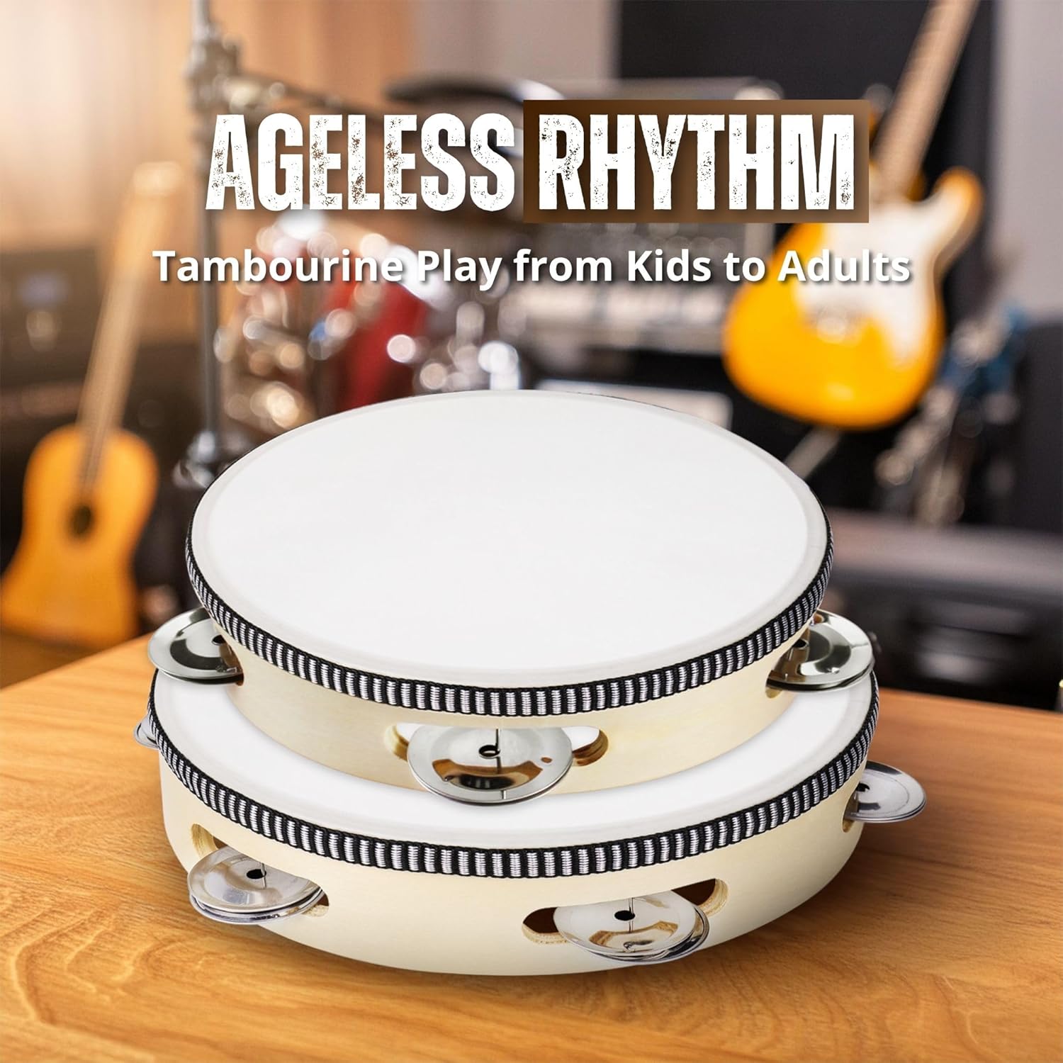 - Set of 2 large and small tambourines - 8" and 6" sizes, with a single-row 4 pairs jingle set for the 6" model, and either a single-row 5 pairs jingle set for the 8" model