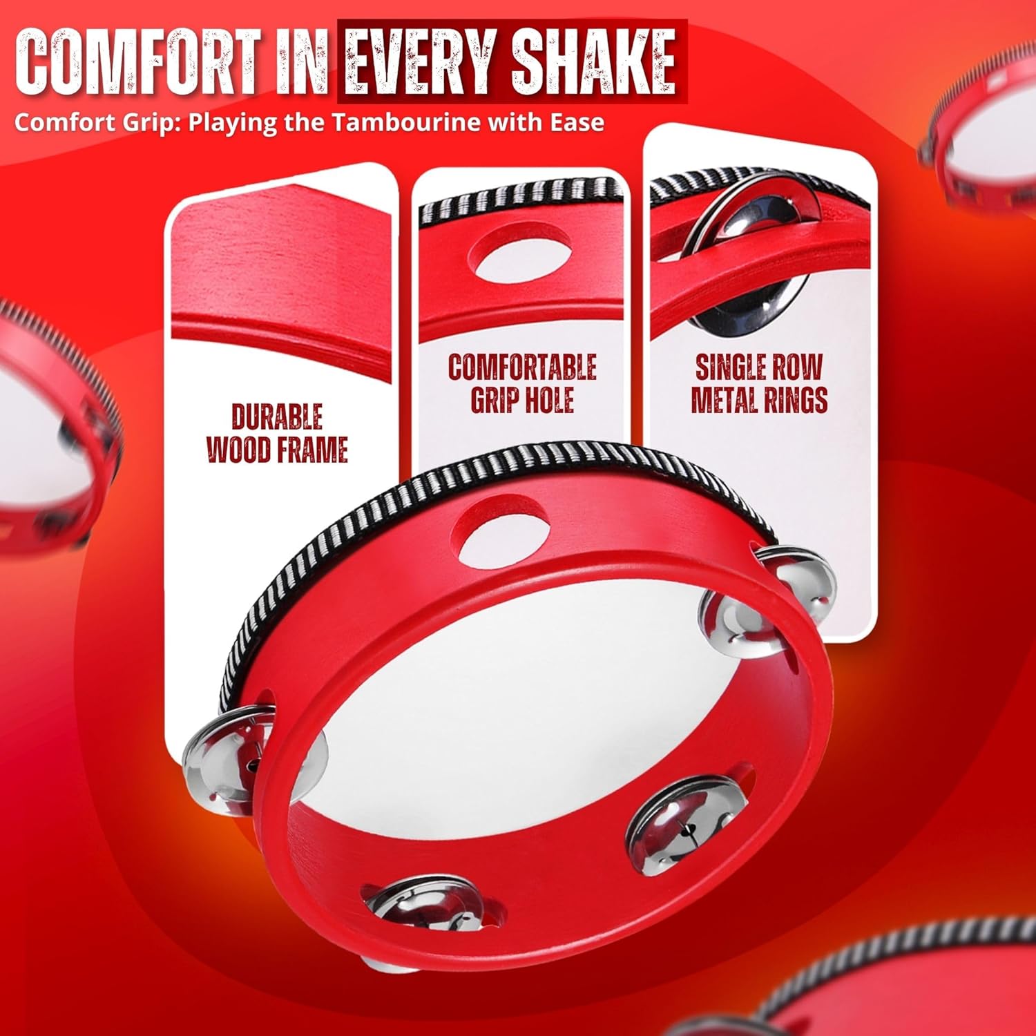 Flexzion Wooden Round Tambourine for Kids and Adults 6" Inch Single Row 8 Pair Jingles, Red Handheld Percussion Instrument for Beginner and Professional Tambourine Player
