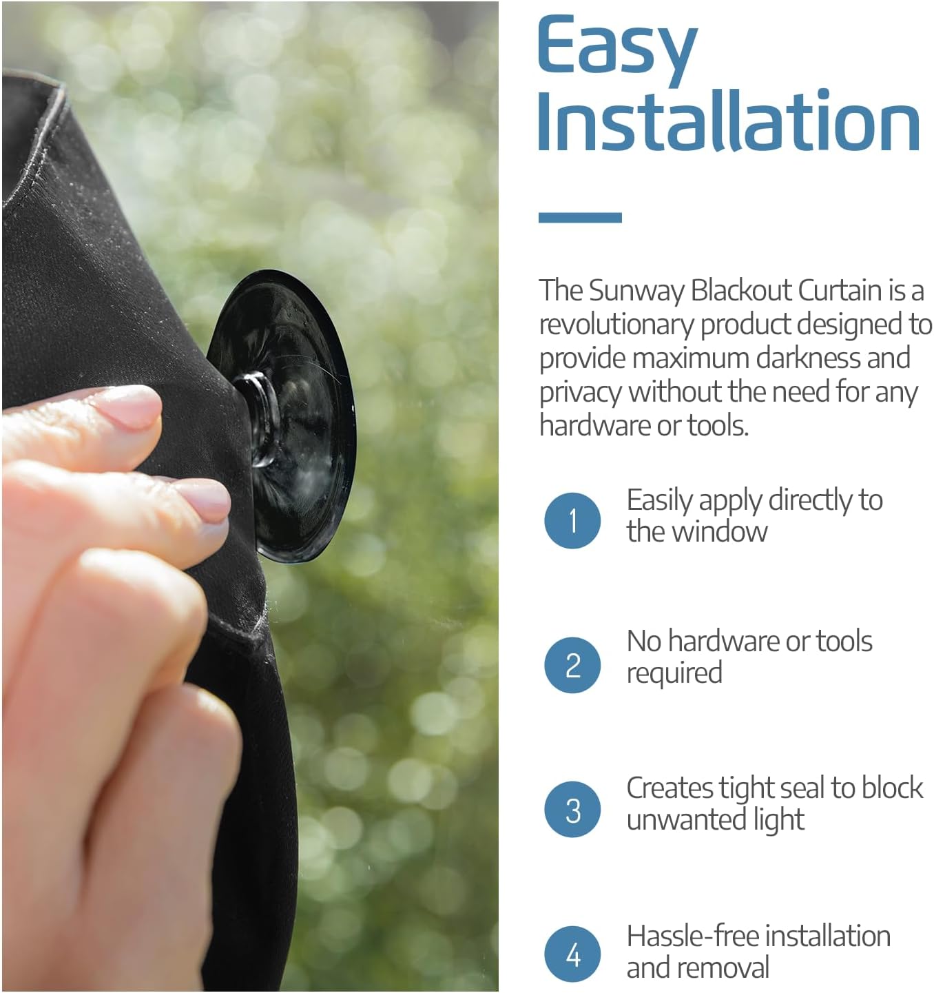 - PORTABLE STICK-ON BLACKOUT BLIND – Easily blackout any rooms windows no matter where you are! The SUN AWAY portable blackout curtain features durable suction cups, making it great when traveling or as a temporary window cover -- Large size of 66"L x 51”W