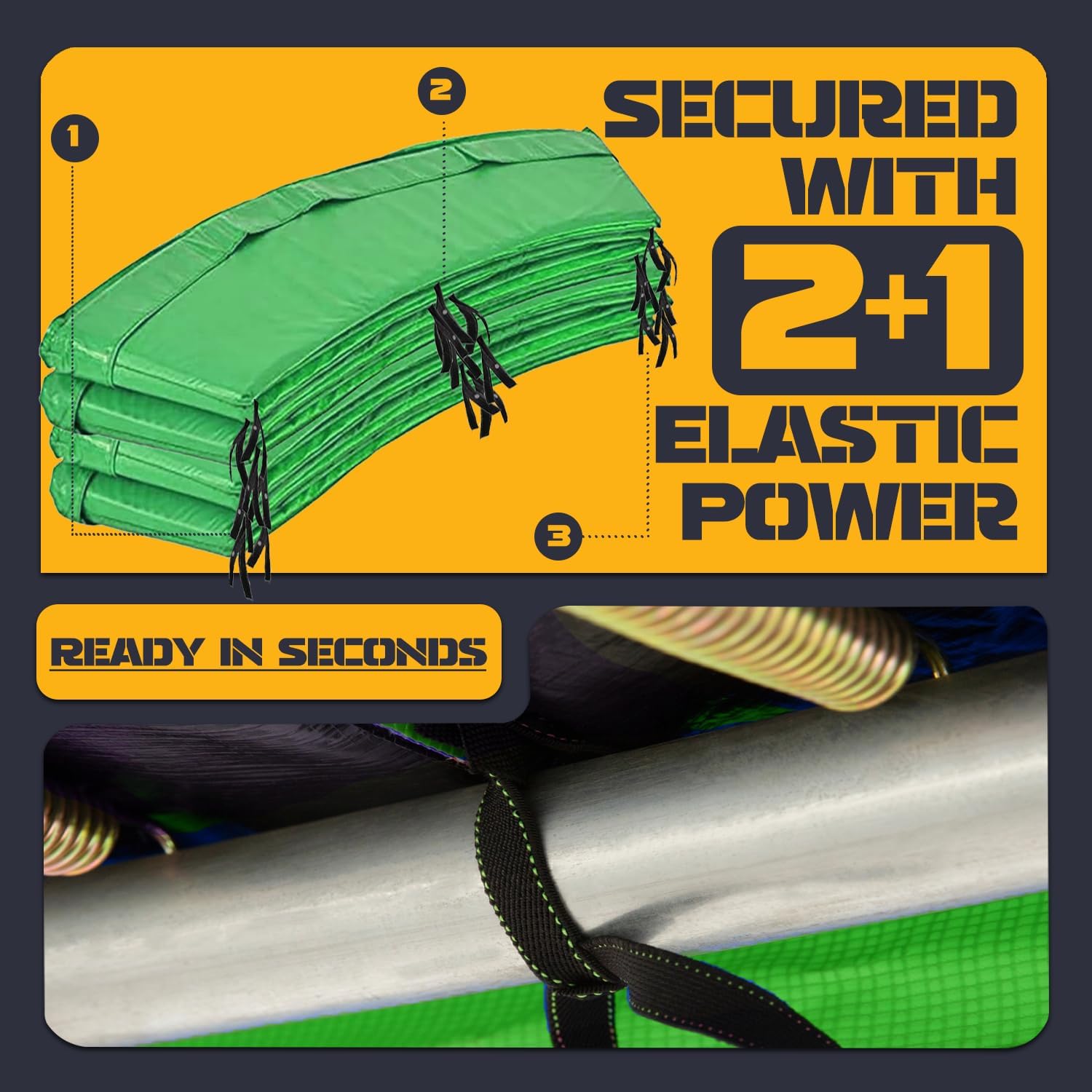 - 👨👩👧👧【270° All-Around Safety Protection】👨👩👧👧At ULTRAPOWER SPORTS, your child's safety comes first! Our trampoline pad replacement is designed to shield kids from exposed springs, preventing injuries while they jump. The extended 270° protective cover wraps around the trampoline frame, offering inside-out protection. Built for durability, it features a 0.55mm thick PVC surface + 0.6-inch protective cotton + an ultra-dense PE bottom, ensuring maximum safety, comfort and fun.