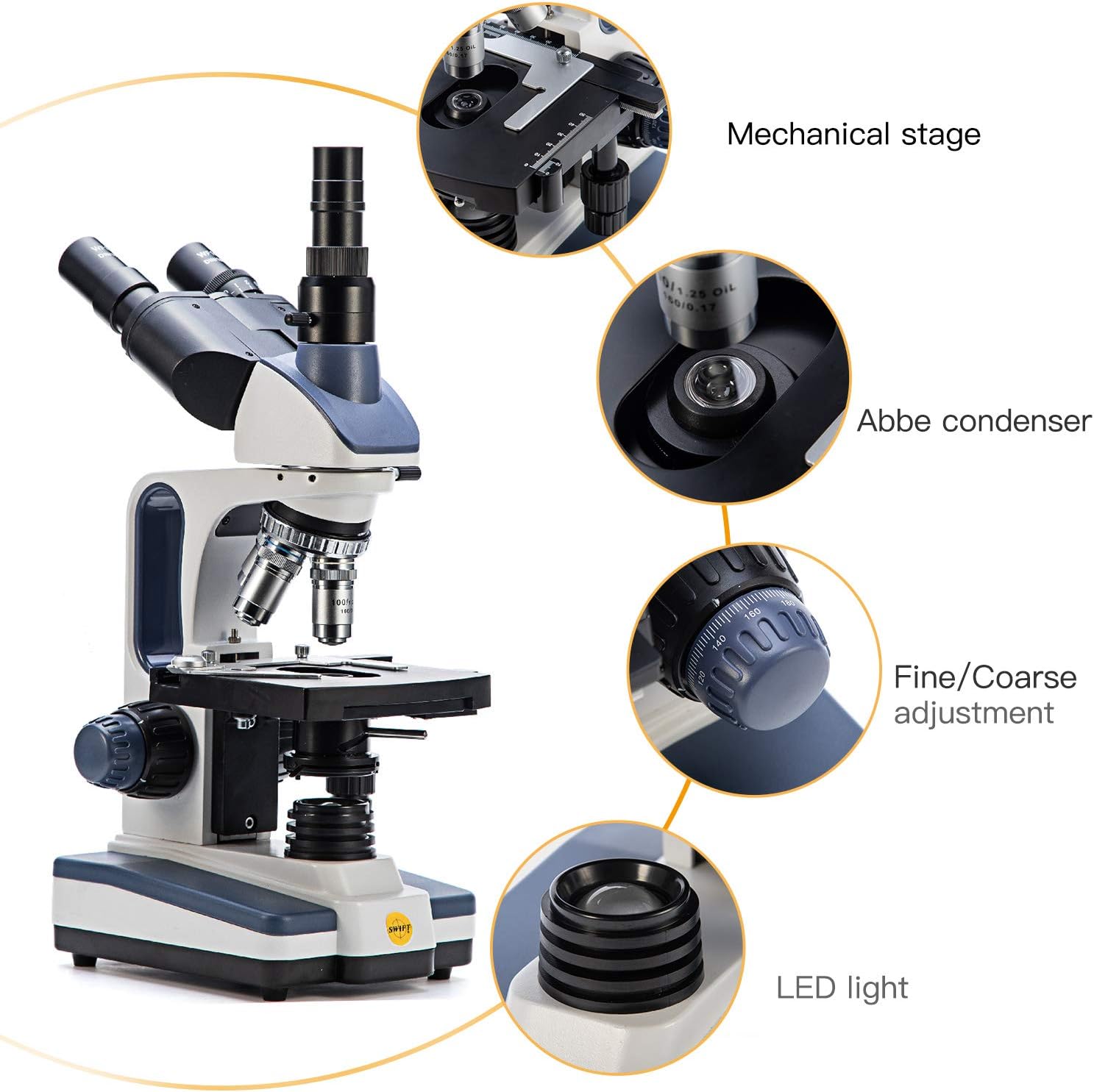 SWIFT Trinocular Compound Microscope SW350T,40X-2500X Magnification,Siedentopf Head,Research-Grade,Two-Layer Mechanical Stage,1.3mp Camera and Software Windows and Mac Compatible