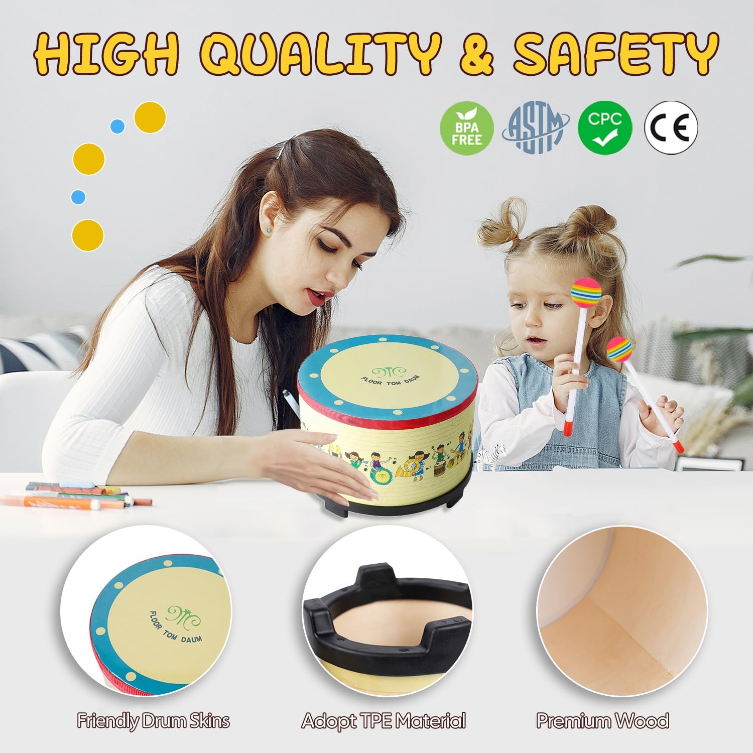 - 2 Ways to Play: Floor drum can be directly hit by hand, and hitting the drum body and drum surface will produce different sounds; Toddler drum set also comes with drumsticks, you can choose different ways to play according to child's preferences. Perfect drum set for toddlers
