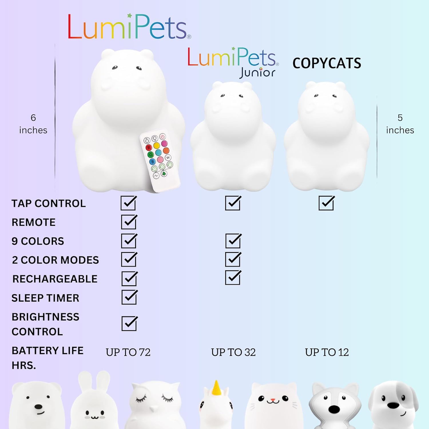 - Animal Night Lights For Boys and Girls - The LumiPet kids night light comes with a remote control, and USB cord. Choose a hippo as your child's new best sleeping friend!