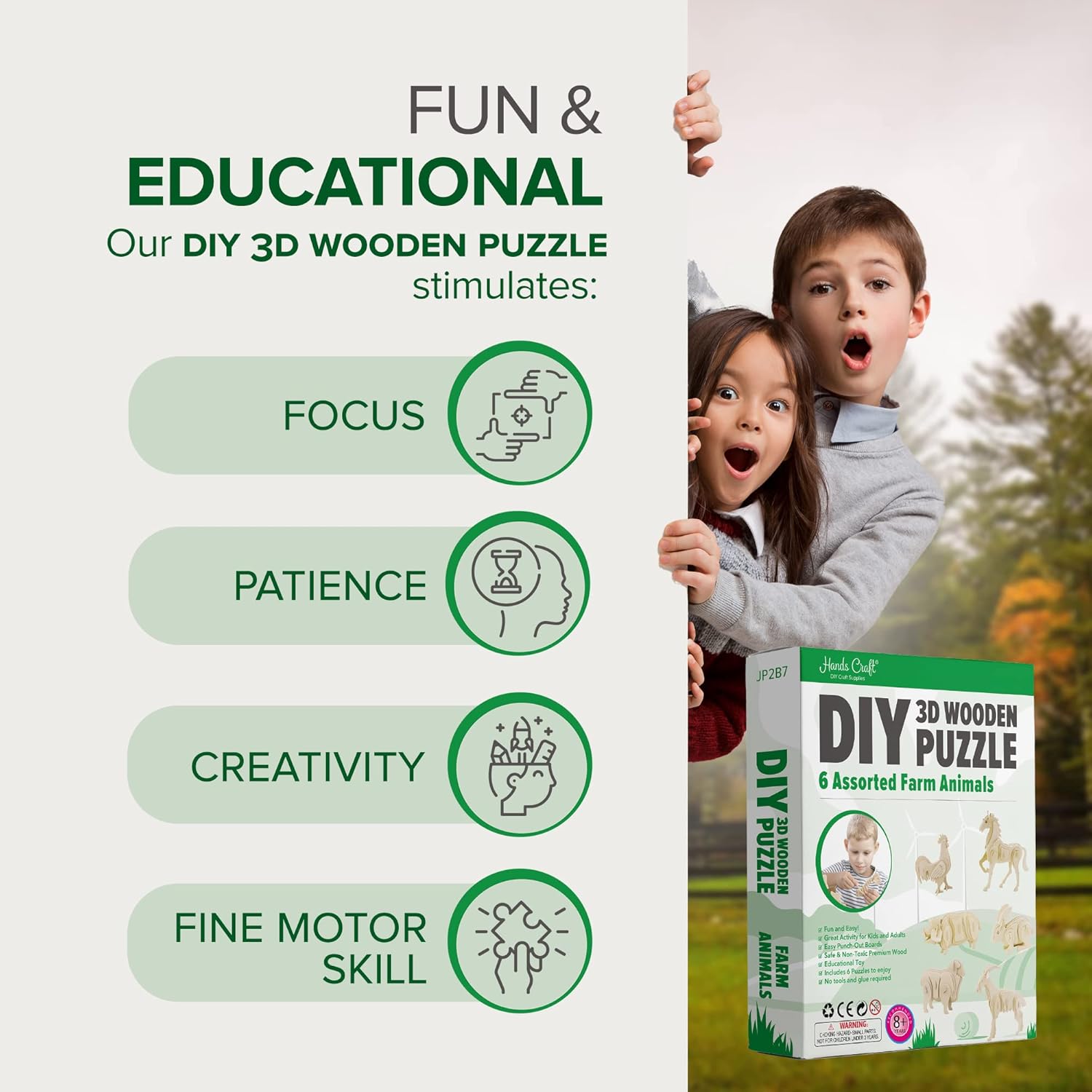 Hands Craft DIY 3D Wooden Puzzle – 6 Assorted Farm Animals Bundle Pack Set Brain Teaser Puzzles Educational STEM Toy Adults and Kids to Build Safe and Non-Toxic Easy Punch Out Premium Wood JP2B7