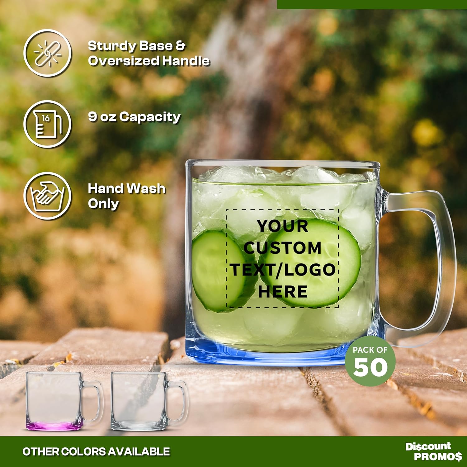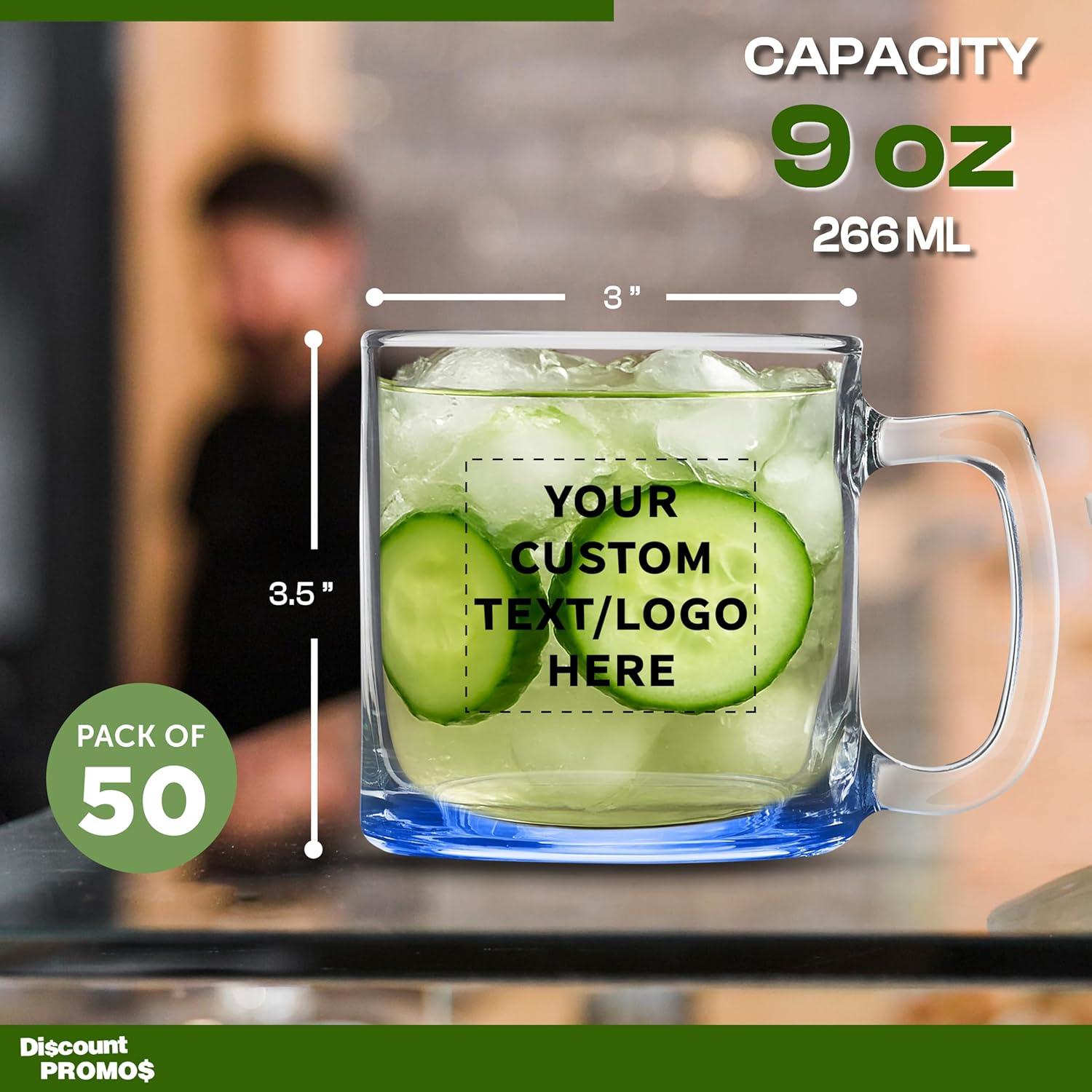 DISCOUNT PTOMOS Custom Small Glass Coffee Mugs 9 oz. Set of 50, Personalized Bulk Pack - Perfect for Coffee, Tea, Espresso, Hot Cocoa, Other Beverages - Blue