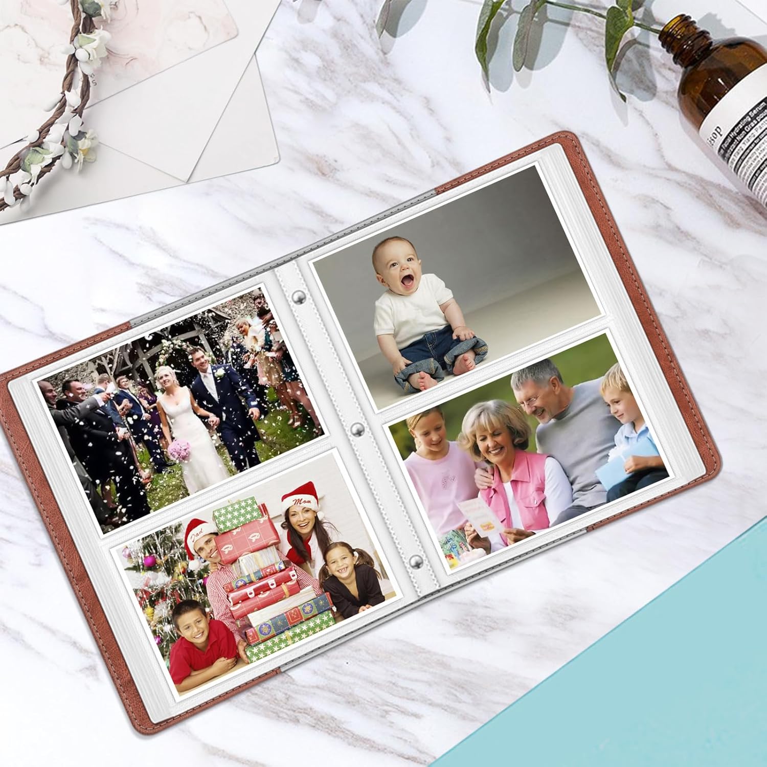 - Hold 112 photos in total. This album contains 28 individual pages with 2 inserts per side [4 photos per page], opens like a book for easy viewing. Designed with insert pocket for credit cards and name cards. Best for weddings, engagements, graduations, baby photos or other arty obsessions.