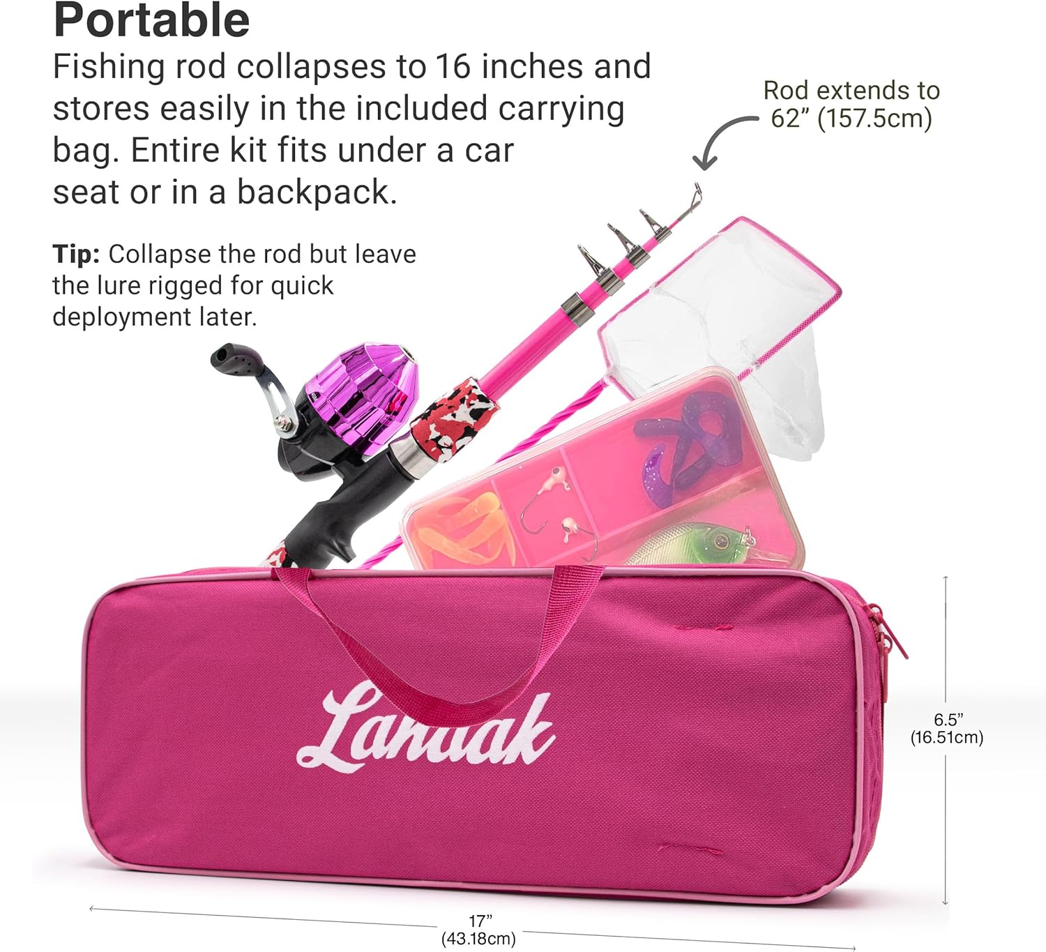 - STARTER FISHING GEAR KIT includes: 65 inch pink telescopic fishing rod, spinning reel, minnow net, beginner’s guide, fishing lures, carry case and tackle box stocked with gear.