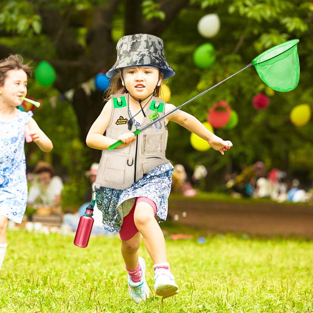 - Nature Explorer & Adventure Kit: Full kids explorer and adventure set includes: Vest, explorer hat, butterfly net, optical 5x binoculars, water bottle buckle, bug jar, magnifying glass, whistle, bug tongs, backpack