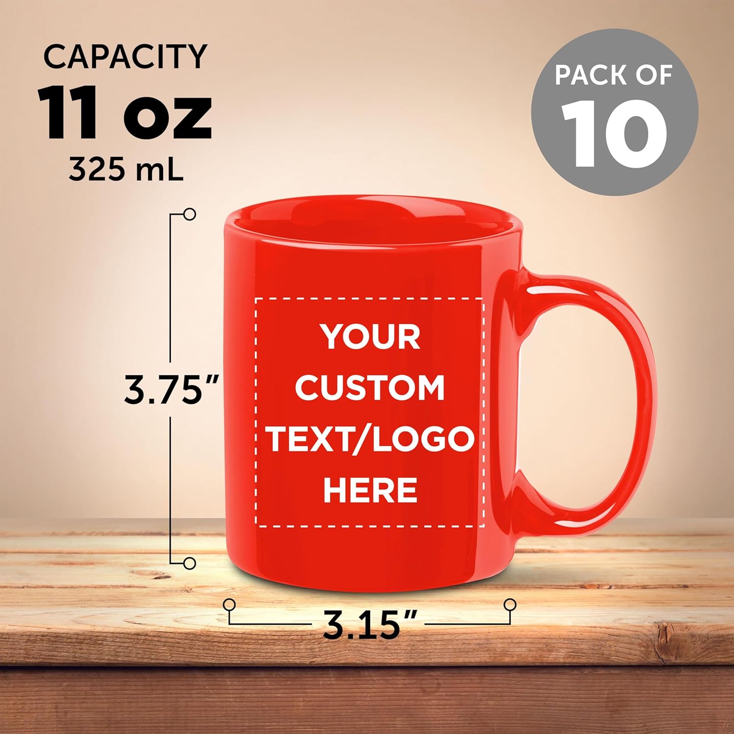 Custom Ceramic Coffee Mugs 11 oz. Set of 10, Personalized Bulk Pack - Coffee cup set, Iced coffee cup, Gaming mug - Red