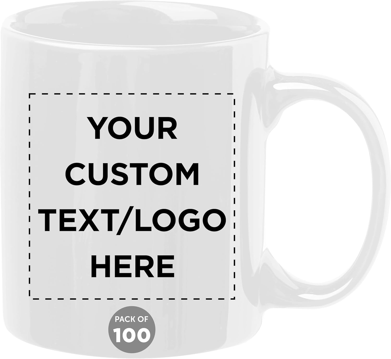 Custom Ceramic Coffee Mugs 11 oz. Set of 100, Personalized Bulk Pack - Coffee cup set, Iced coffee cup, Gaming mug - White