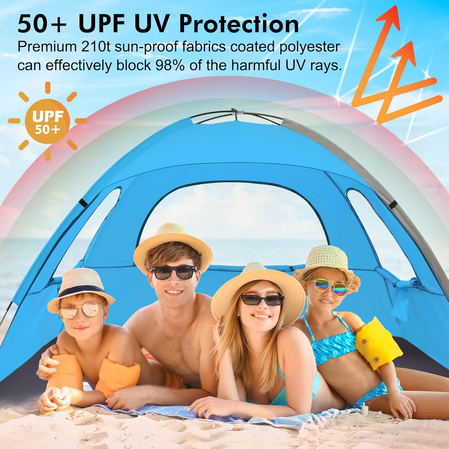 - UPF 50+ Protection & Excellent Ventilation: Our beach tent is made of premium 210t sun-proof material coated polyester, it can effectively block heat and 98% of the harmful UV rays. 3 super large roll up mesh windows increase airflow and reduce the temperature. It helps keep summer's scorching heat away from your family and allows you to enjoy the oceanic breeze with a comfortable space.