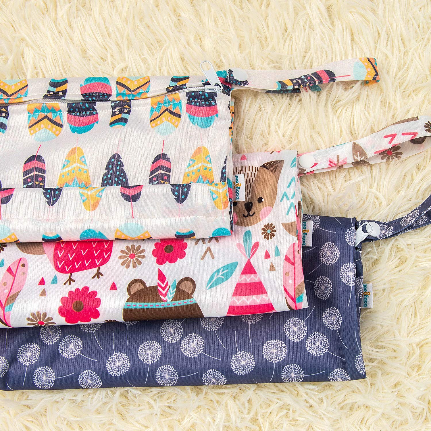 - Double-Pocket Design with Snap Handle: Each wet bag contains two pockets, which comes with two zip closures to ensure that nothing will drop out of the bag and better to keep the clean and dirty items separately. With the snap handle design, you can unbutton the haddle and easily hang the bag on the stroller or door knobs, towel rod ect. anywhere you want.