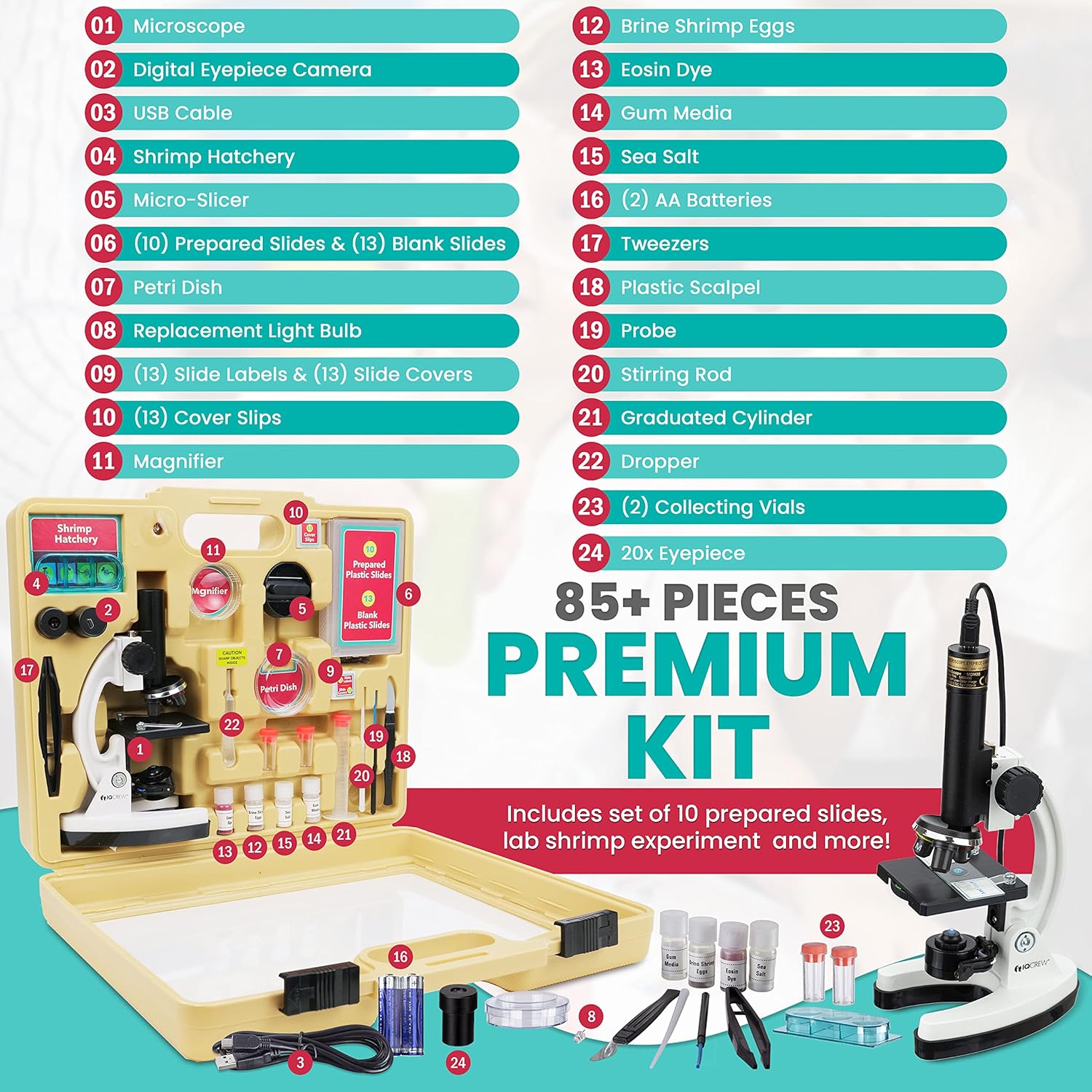 - Premium kit includes over 85 pieces - blank and prepared slides, experiment ideas, tools and other accessories all in a rugged ABS plastic carrying case