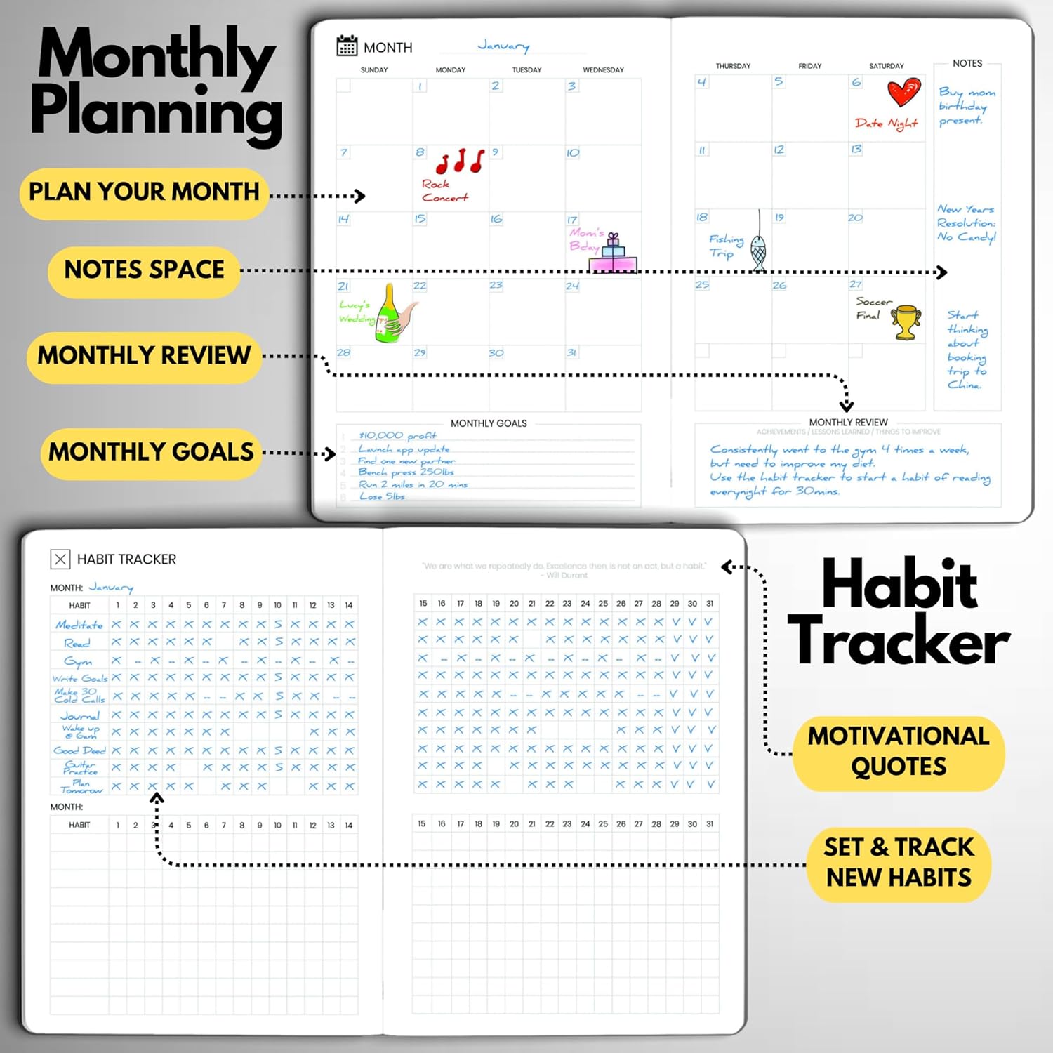 - STAY ALIGNED WITH YOUR GOALS – Use built-in goal-setting tools and review prompts to stay focused on long-term success—whether you’re managing business milestones, career growth, or personal development.