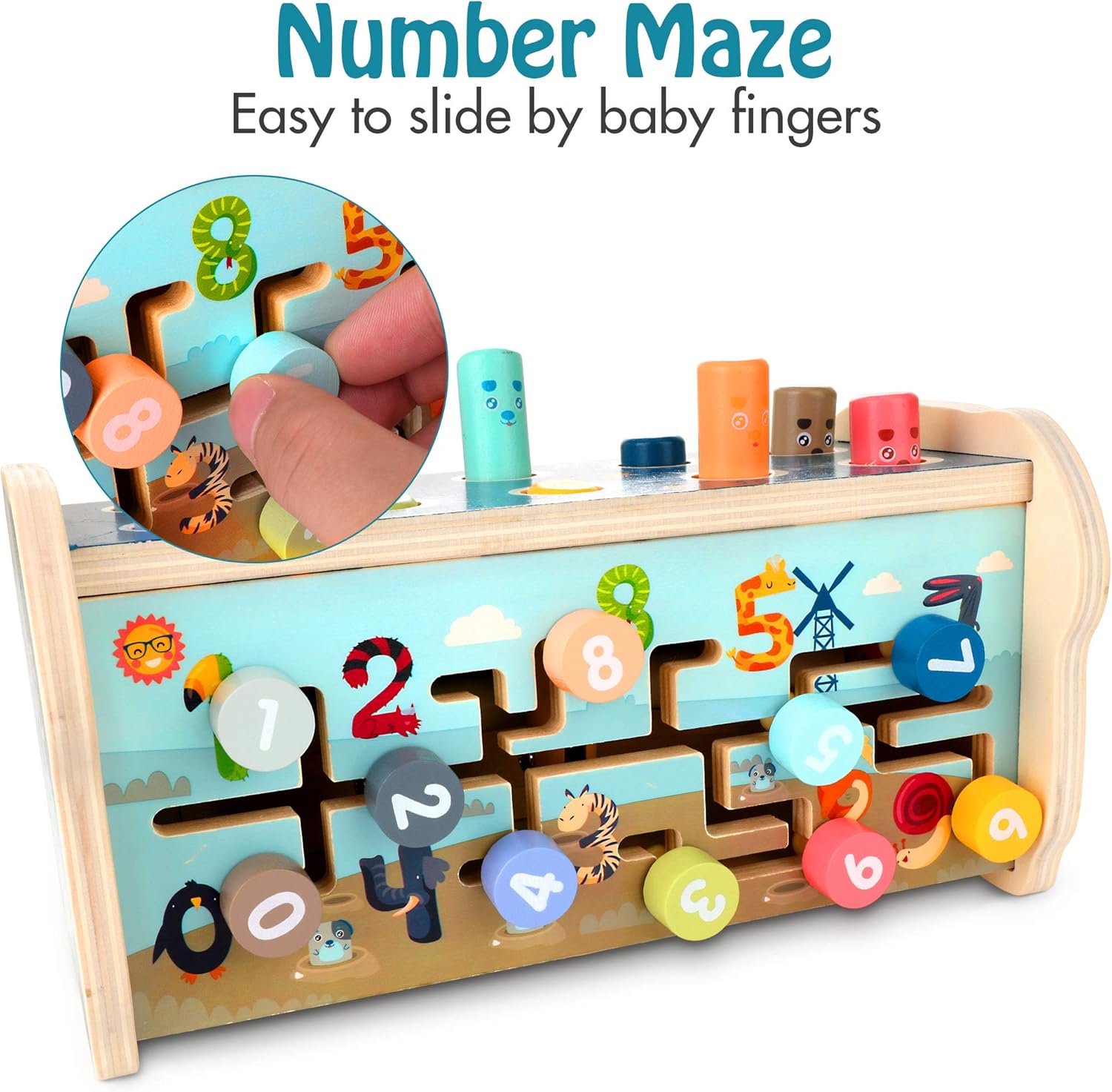 - EDUCATIONAL YET JOYFUL: A simple yet complete montessori-inspired wooden toy for toddlers 12m+! Pounding develops hand-eye coordination, fine motor skills, and arm strength. The 8-note xylophone sparks audio recognition & musical curiosity. Number maze puzzles boost counting skills & cognitive workout – nurturing holistic growth through joyful play.