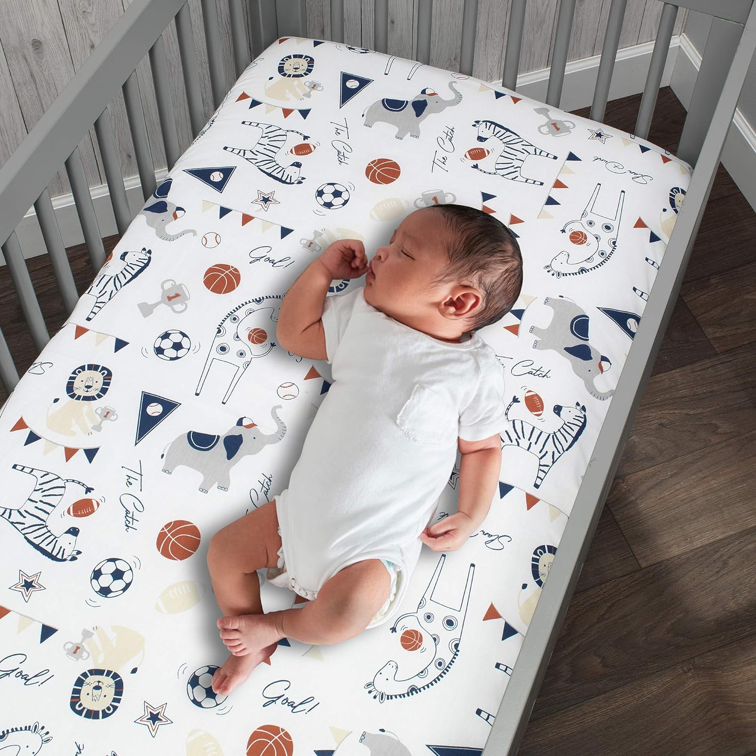 - The breathable 100% cotton fitted crib sheet with animals playing their favorite sports has elastic all around for a safe and secure fit on a standard size crib mattress