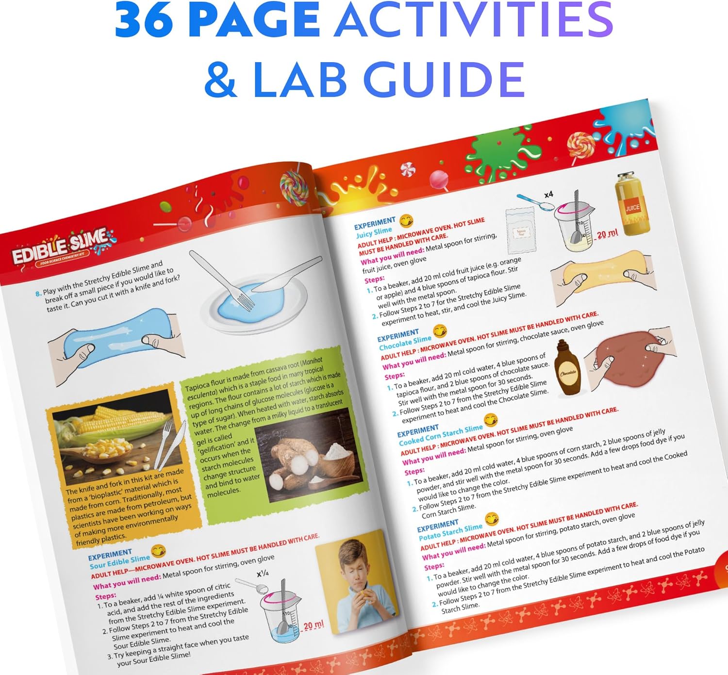 - LOADED WITH VALUE - Filled with over 25 experiments, a 20 page activities and lab guide, and over 25 tools & ingredients, our Edible Slime Candy making kit offers only the best science projects for kids ages 8-12. The ideal "my first science kit" with a real science lab feel. STEM for kids has never been this tasty! (Some additional common household supplies may be necessary for some experiments)